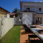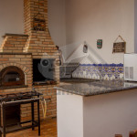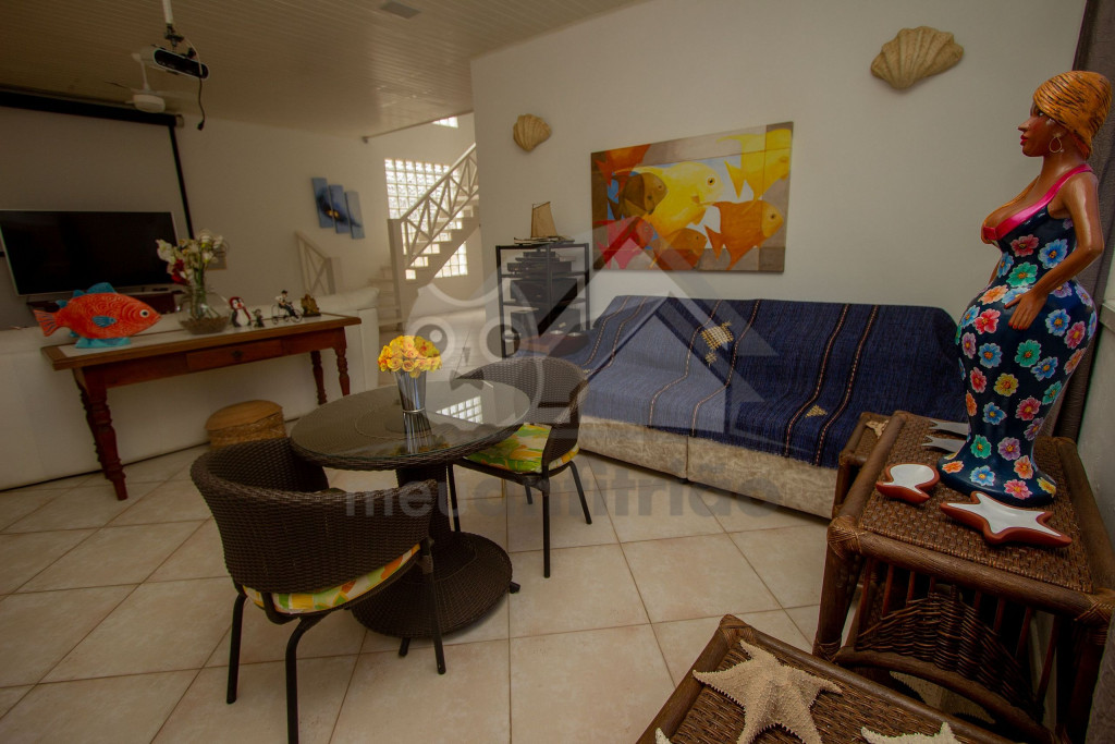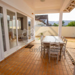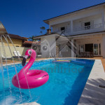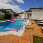 O piso térreo, conta com área externa e jardins para relaxar, sala de TV, de estar e de jantar integradas, lavabo, cozinha completa e uma ampla área de lazer com churrasqueira, fogão industrial, uma piscina, além de espreguiçadeiras para relaxar, ducha, geladeira extra e mesas com 12 e 8 lugares.