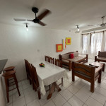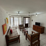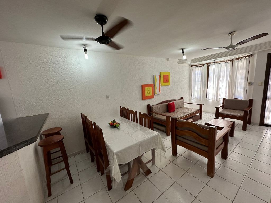 Logo na entrada possui uma ampla sala conjugada com a copa, no qual são compostas com sofá cama de madeira com espumas e almofadas, (acomoda 2 pessoas), 2 poltronas ,mesa de centro, ventilador de teto, rack e TV tela plana. Mesa de madeira com 6 cadeiras.
