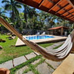 Na sala, móveis rústicos dão um ar de fazenda. A atmosfera campestre estende-se até a varanda, de onde se pode apreciar a imensidão do terreno. Todas as suítes têm ar split. Duas delas abrem-se para um terraço com vista para um bosque denso, muito visitado por pássaros tropicais.