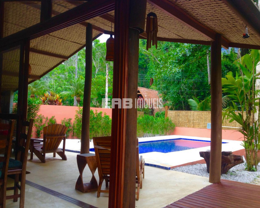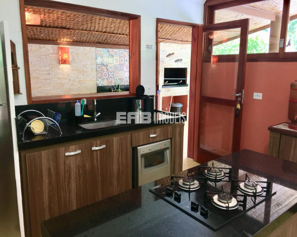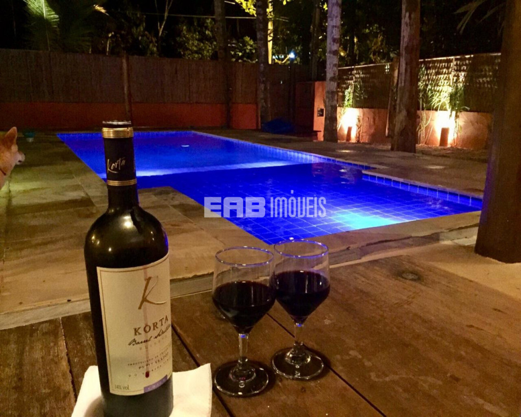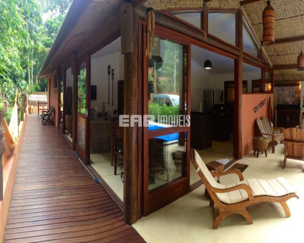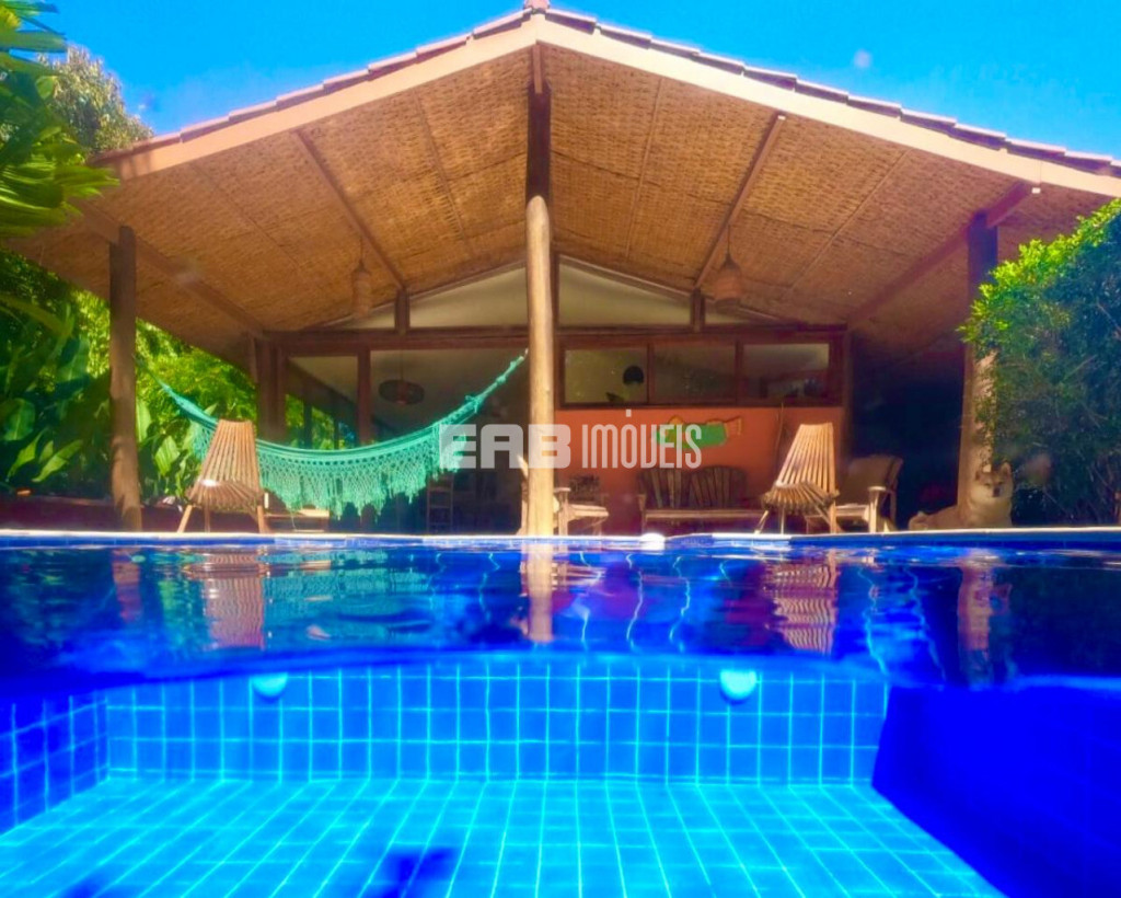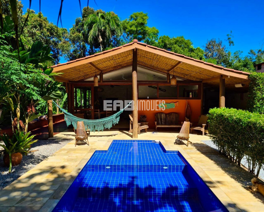 Por uma trilha atrás da casa, ou pela rua principal, são apenas 3 minutos para se chegar à praia. A área de convívio compreende sala com cozinha integrada que se estende até à varanda com churrasqueira e piscina, de onde se observam os pássaros coloridos que visitam o local.