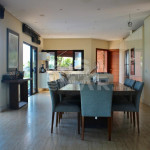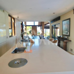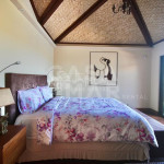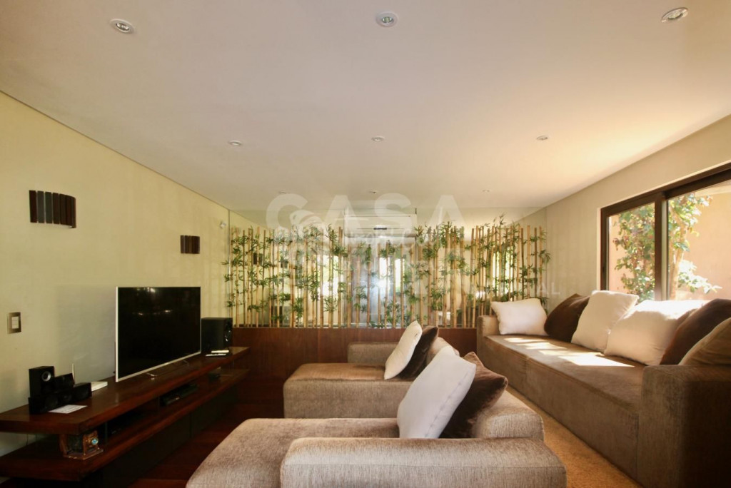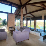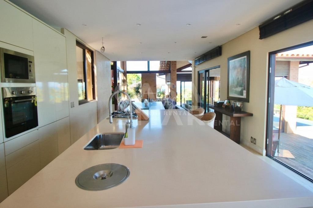 Na casa principal temos uma sala de tv, cozinha e sala de jantar integrados, uma saleta na frente da lareira e a sala de estar principal de frente para a piscina. A piscina abraça a casa, com áreas mais rasas tipo praianha com espreguiçadeiras, um raia para os nadadores e área profunda, toda com borda infinita. Na área externa tem um espaço gourmet coberto com churrasqueira, forno a lenha e mais mesas e cadeiras. Próximo a churrasqueira tem uma sauna, banheiro completo em uma suíte de apoio.