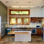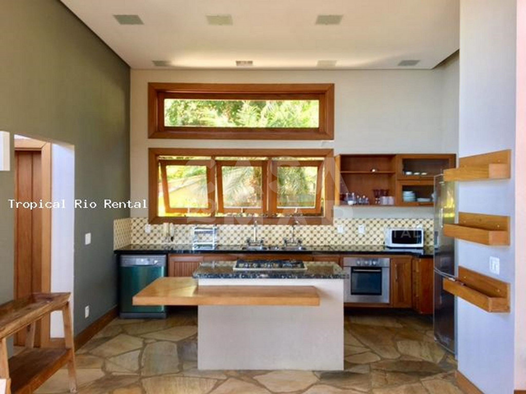 A cozinha está totalmente equipada com geladeira, fogão, forno, microondas e utensilios.