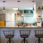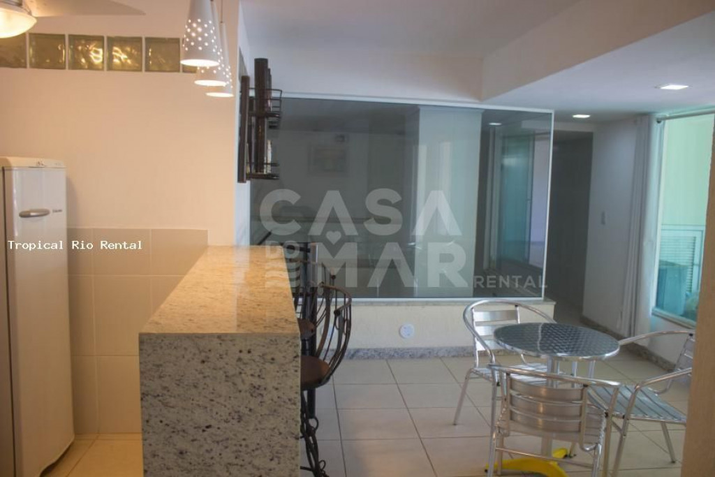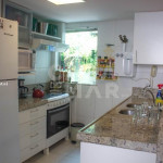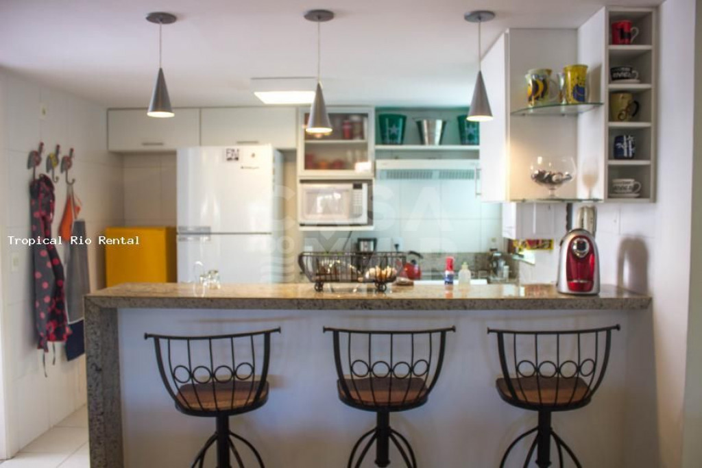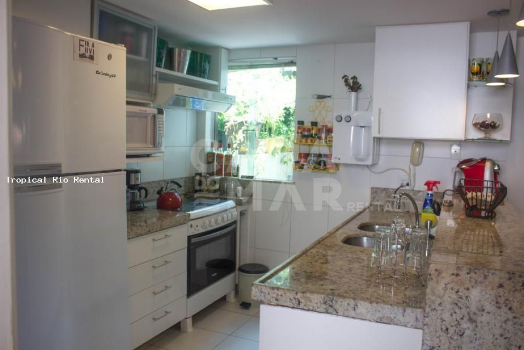 A cozinha está totalmente equipada com geladeira, fogão, forno, microondas e utensilios.