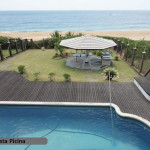 Deck de madeira contornando piscina;