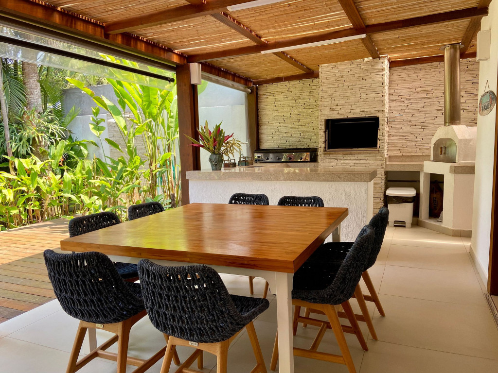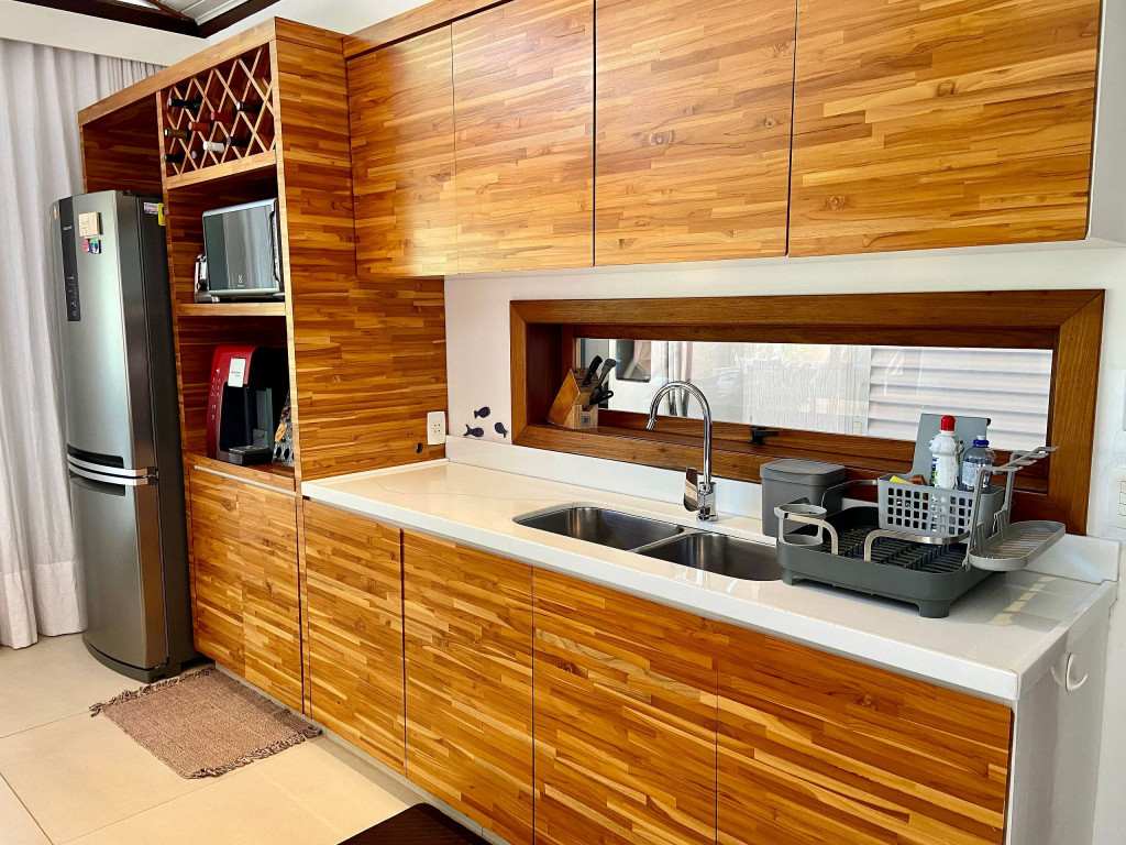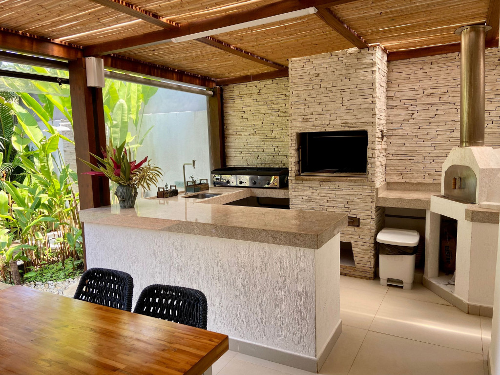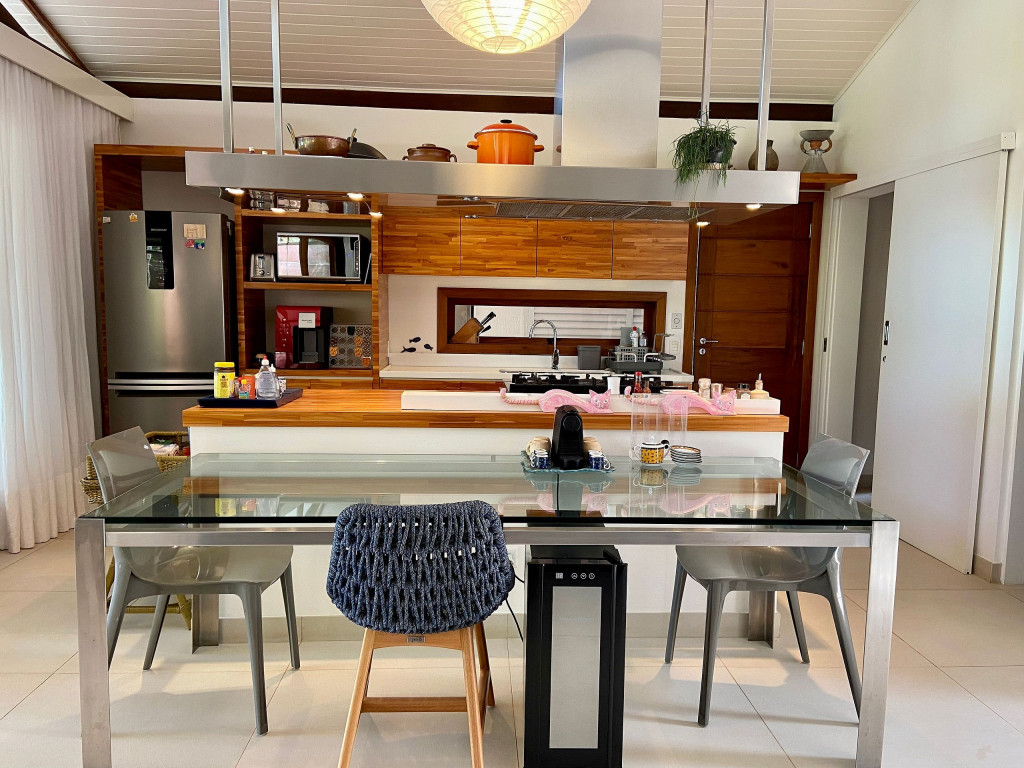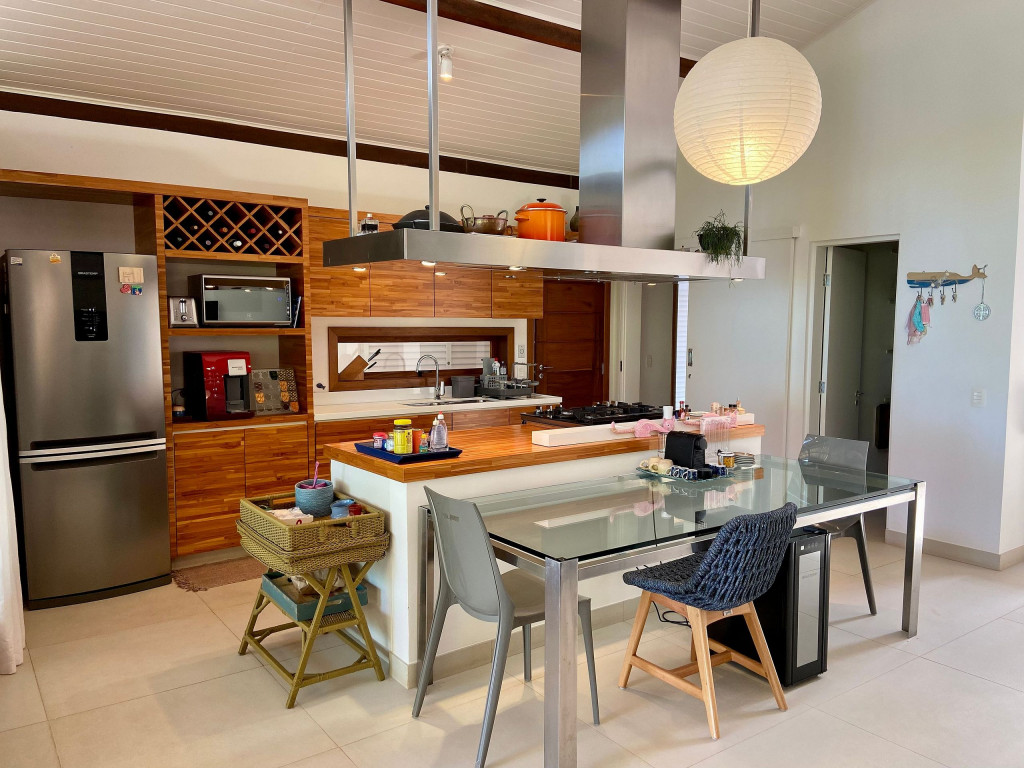A cozinha é equipada com lava louça, duas geladeiras, filtro B.Blend Brastemp, cervejeira, fogão 5 bocas, coifa e microondas. Possui também lavadora e secadora de roupas, que pode ser utilizada pela(s) empregada(s) durante as hospedagens, geralmente para períodos acima de 5 noites.A churrasqueira é equipada com uma chapa e também um forno de pizza. No quintal tem um Noori Fogo & Design: primeiro fogão a lenha, churrasqueira, forno de pizza e aquecedor em única peça.