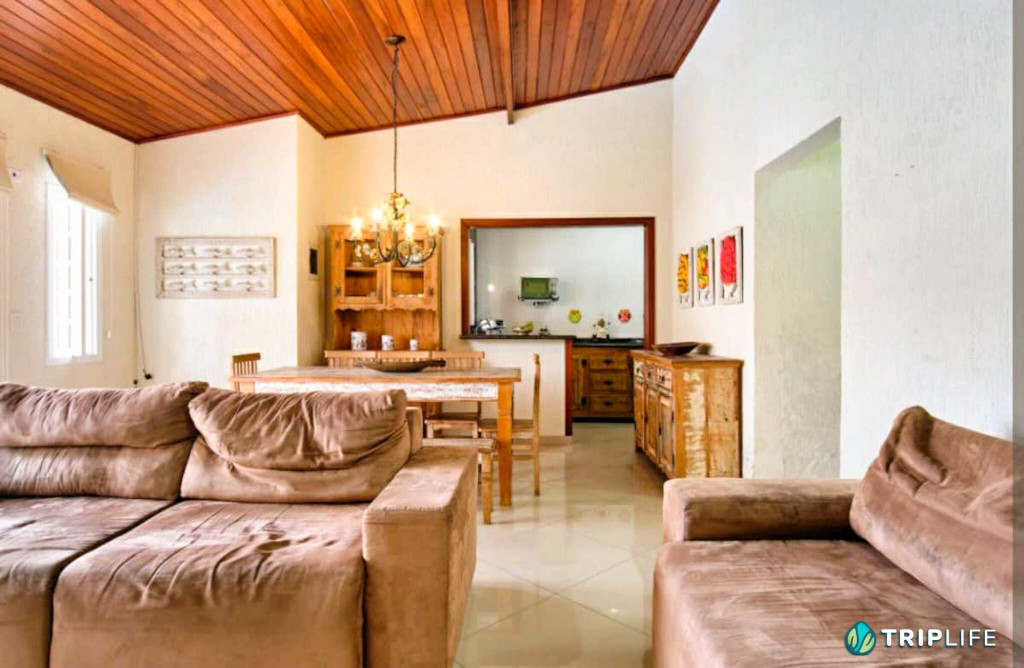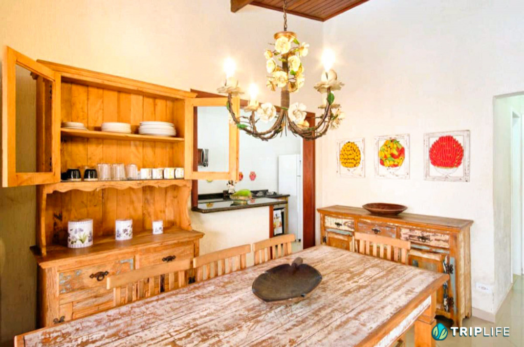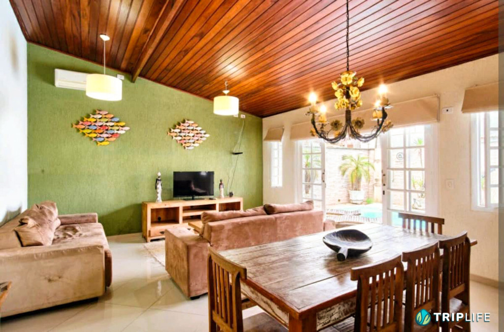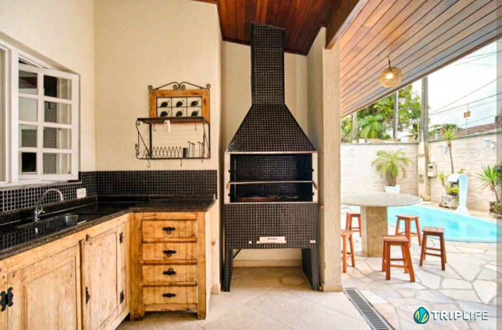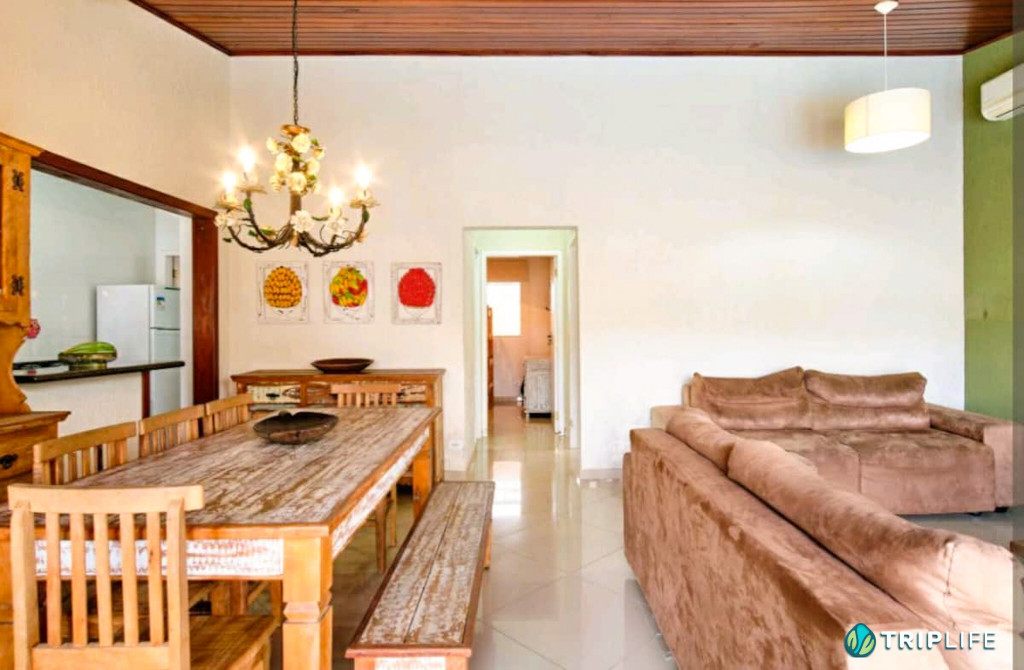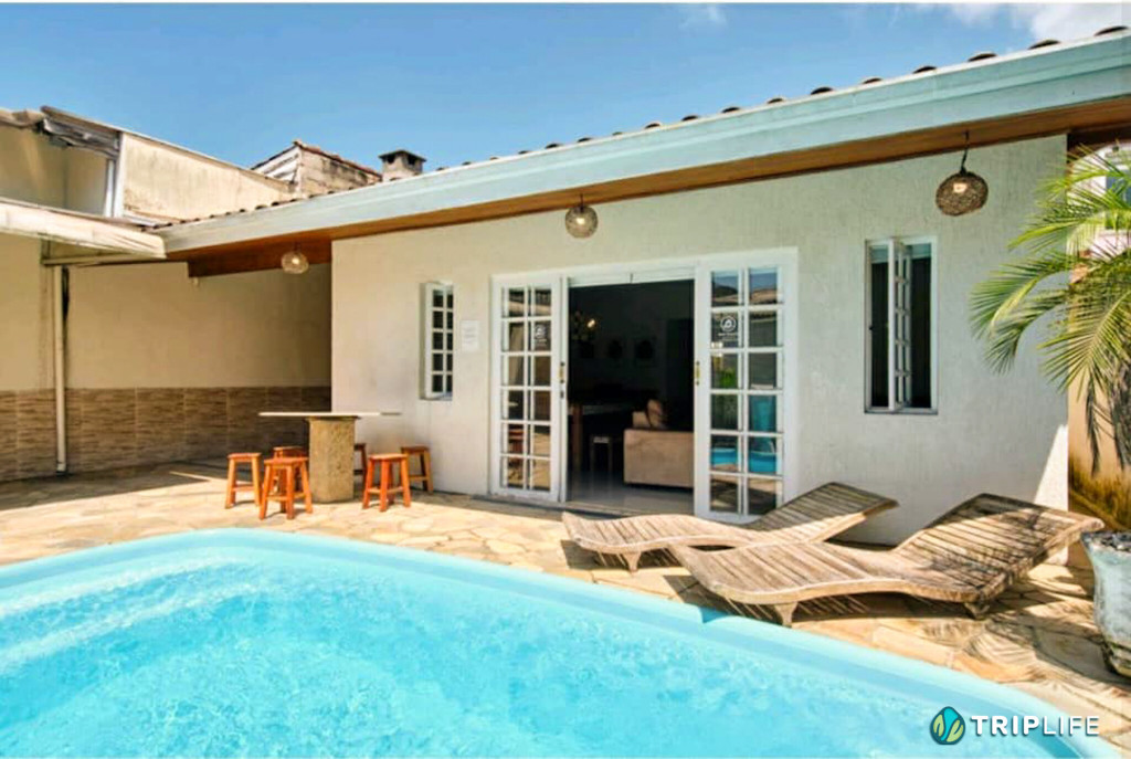 Casa com decoração rústica para 8 pessoas na rua mais badalada de Ubatuba, perto dos barzinhos, restaurantes e a 80 metros da praia! Conta com dois quartos com ar condicionado – um deles com duas beliches e o outro com uma cama de casal e uma beliche -, cozinha totalmente equipada, sala de estar, área de jantar e área gourmet com piscina e churrasqueira.
