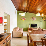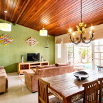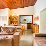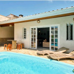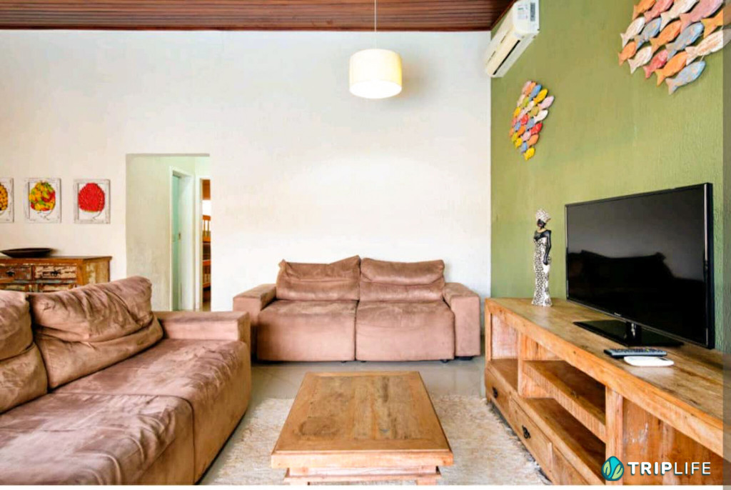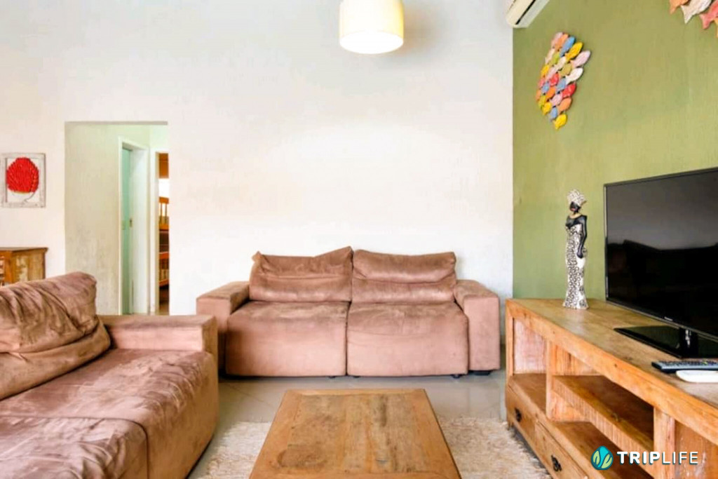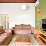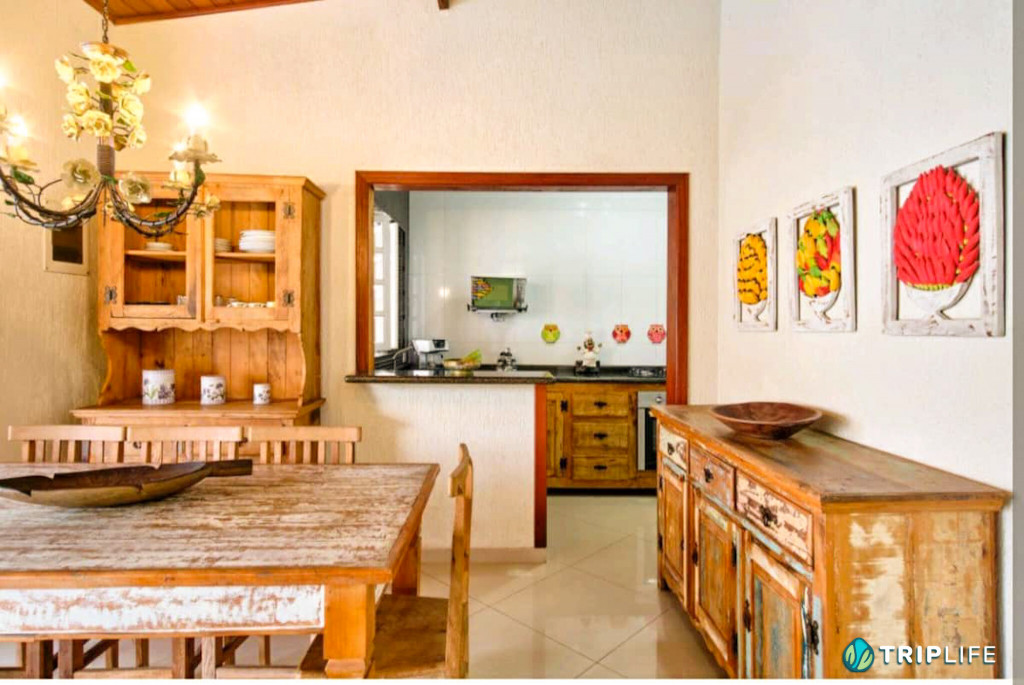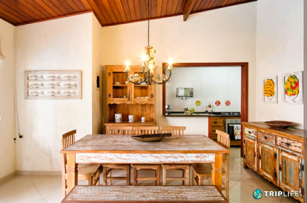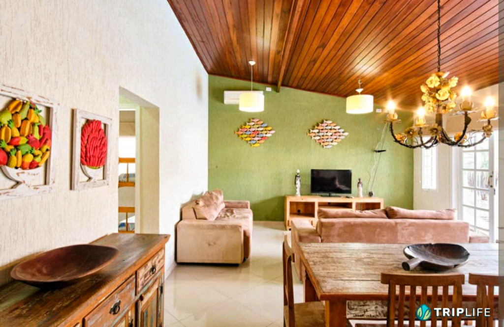 Casa com decoração rústica para 8 pessoas na rua mais badalada de Ubatuba, perto dos barzinhos, restaurantes e a 80 metros da praia! Conta com dois quartos com ar condicionado – um deles com duas beliches e o outro com uma cama de casal e uma beliche -, cozinha totalmente equipada, sala de estar, área de jantar e área gourmet com piscina e churrasqueira.