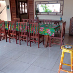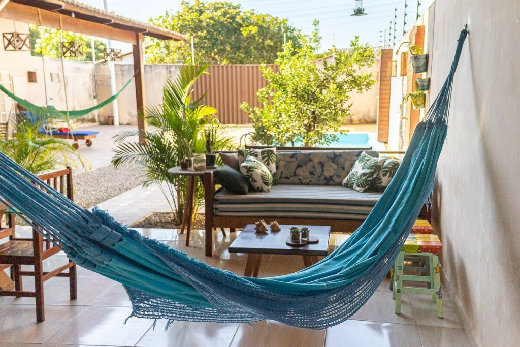 Varanda com espaço para redes e uma enorme mesa de madeira com 10 lugares, ideal pra confraternização da turma toda;