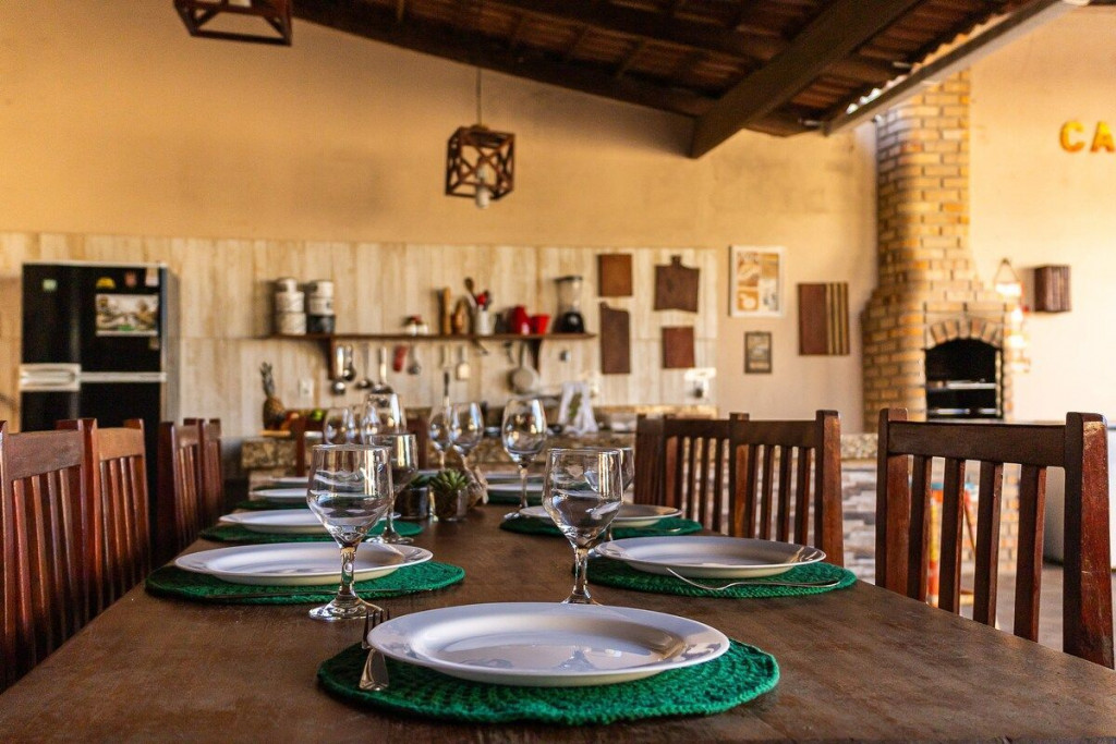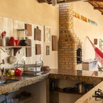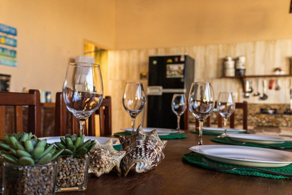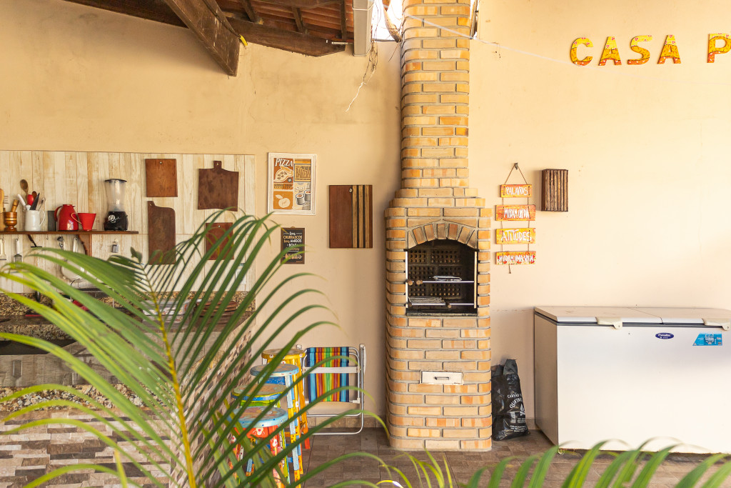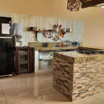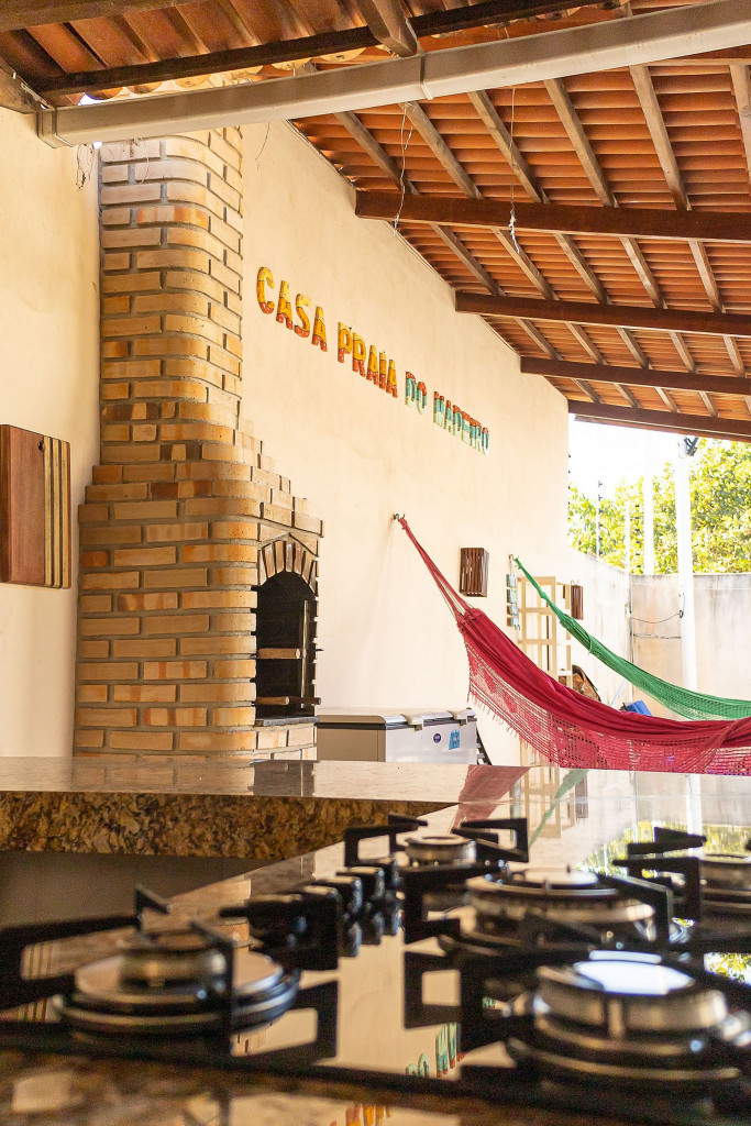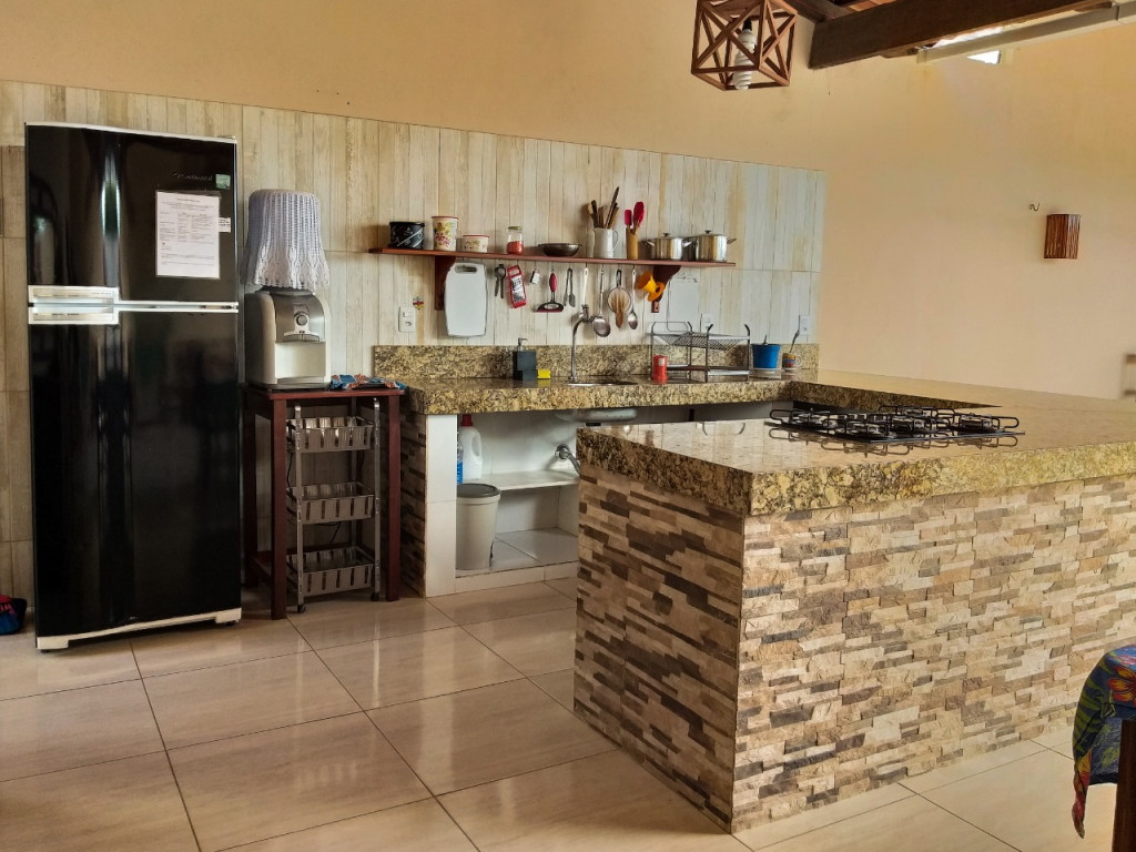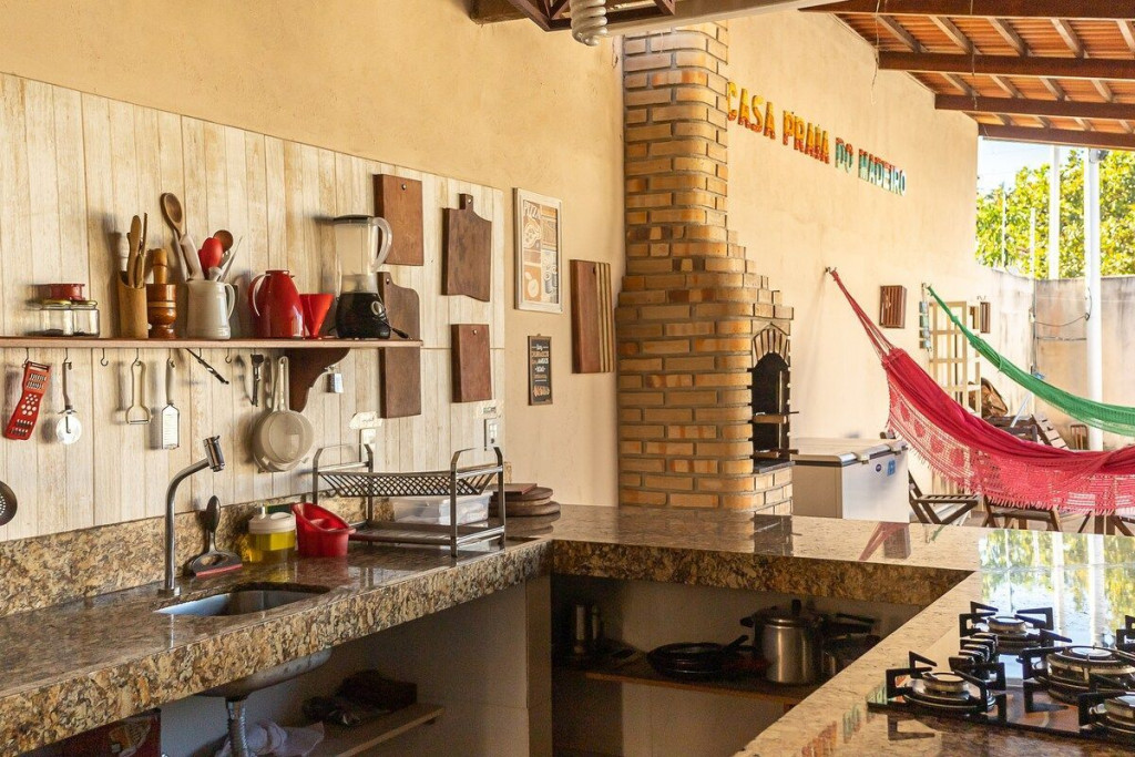 O DIFERENCIAL da nossa casa é a cozinha na varanda com vista pra piscina. Completinha e equipada com fogão cooktop numa enorme bancada de granito, geladeira, forno elétrico, sanduicheira, panelas, louças e todos os utensílios necessários;