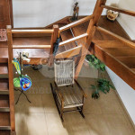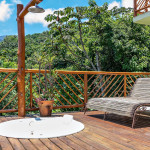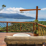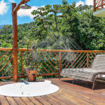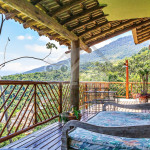 Saindo pela porta de vidro da sala, o hóspede poderá aproveitar nossa varanda com sofás, cadeiras, churrasqueira, fogão a lenha e rede para descanso. Há ainda, um deck inferior, onde o hóspede encontrará um ambiente com vista para mata, um sofá externo e uma ducha