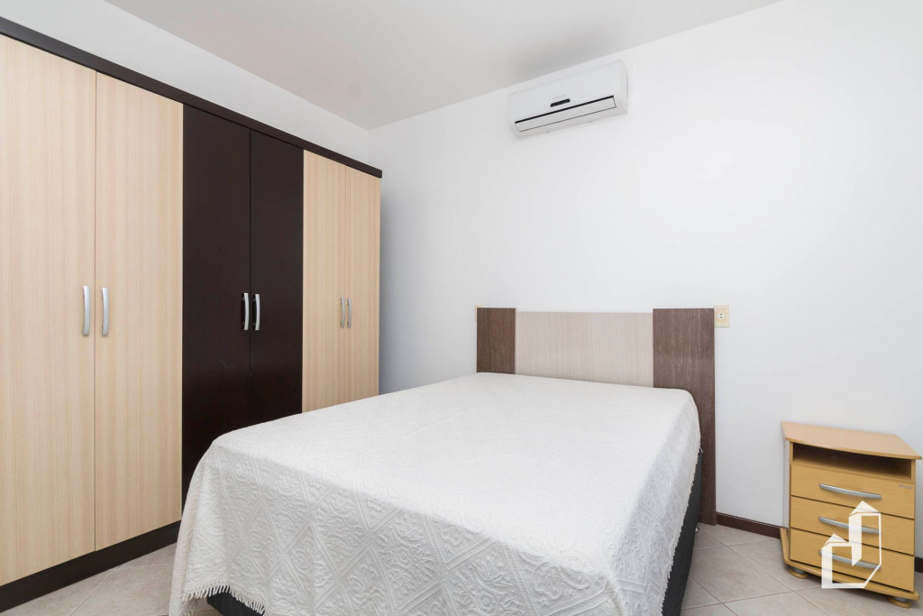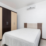 01 dormitório com uma cama de casal e um beliche com ar-condicionado.