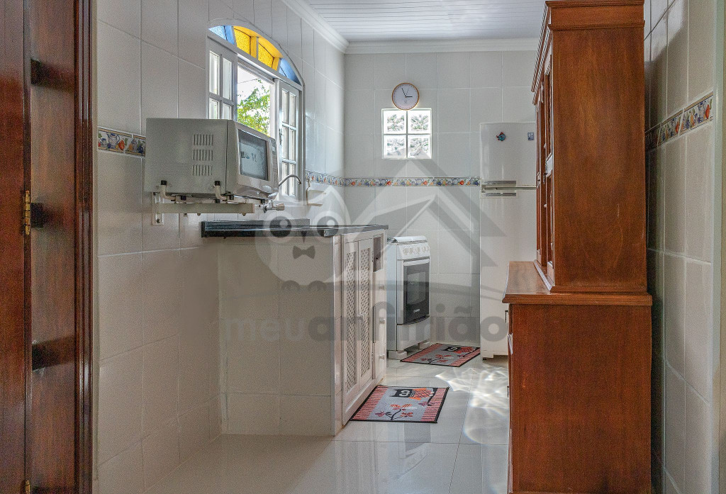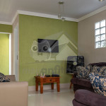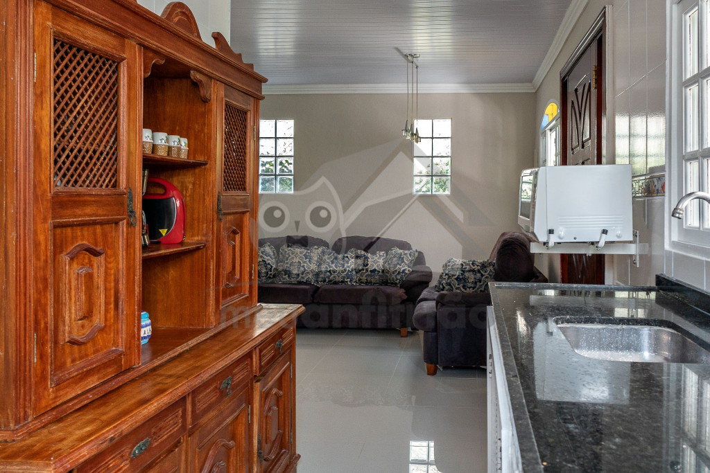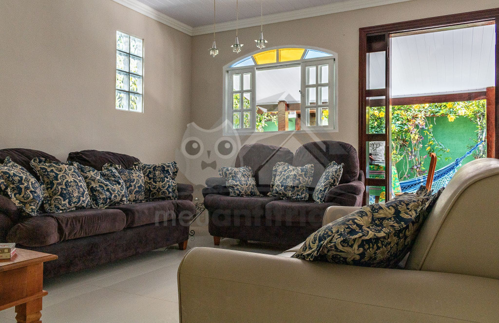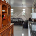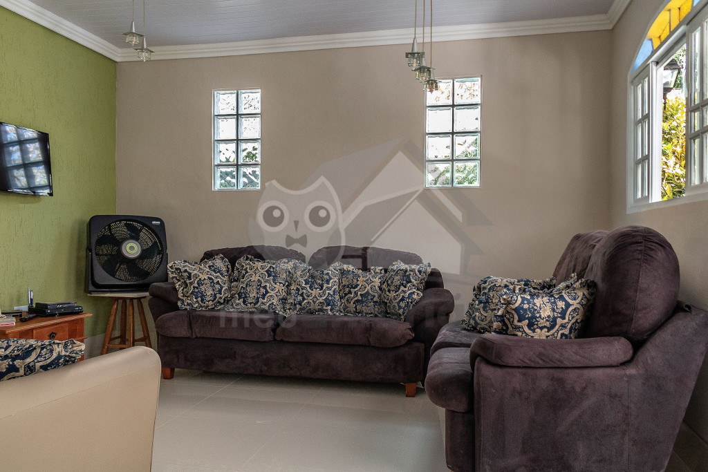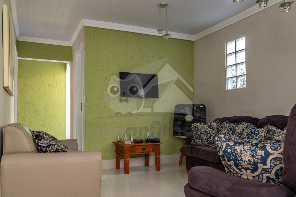 Entrando na casa, temos um espaço em conceito aberto que integra sala de estar e cozinha. A sala de estar conta com sofá e TV e a cozinha conta com utensílios necessários para uma estadia prática.