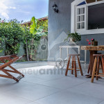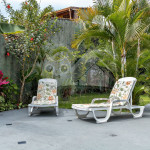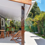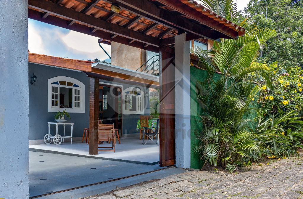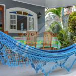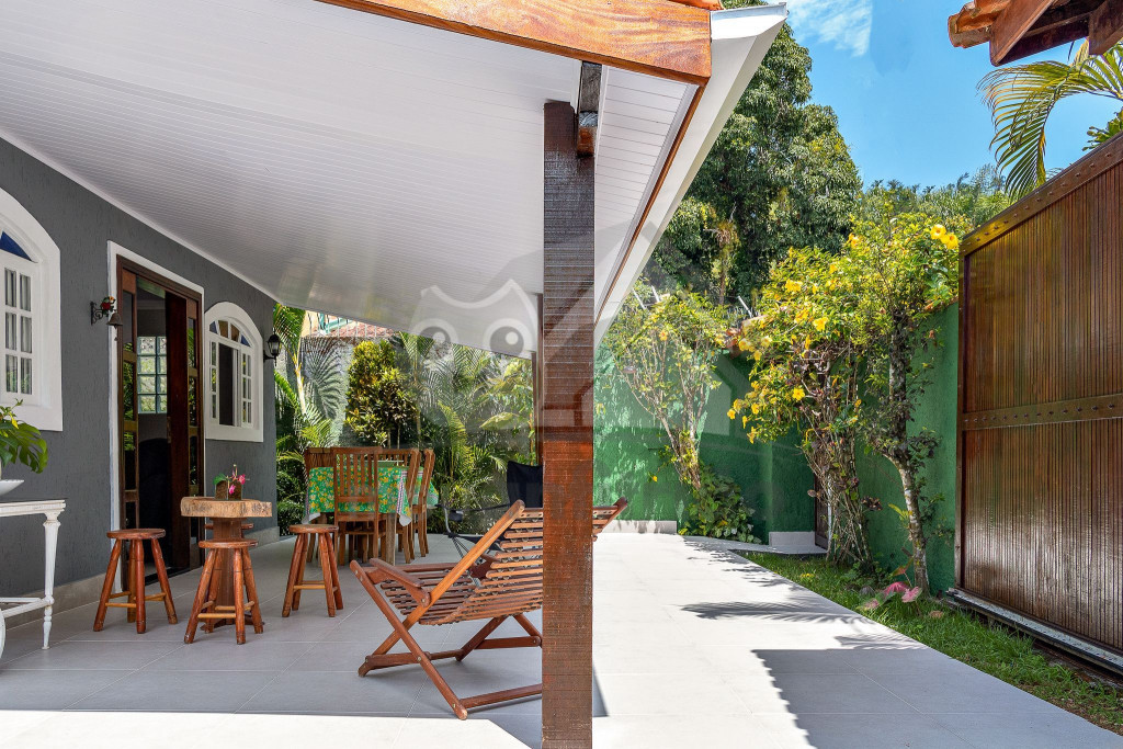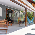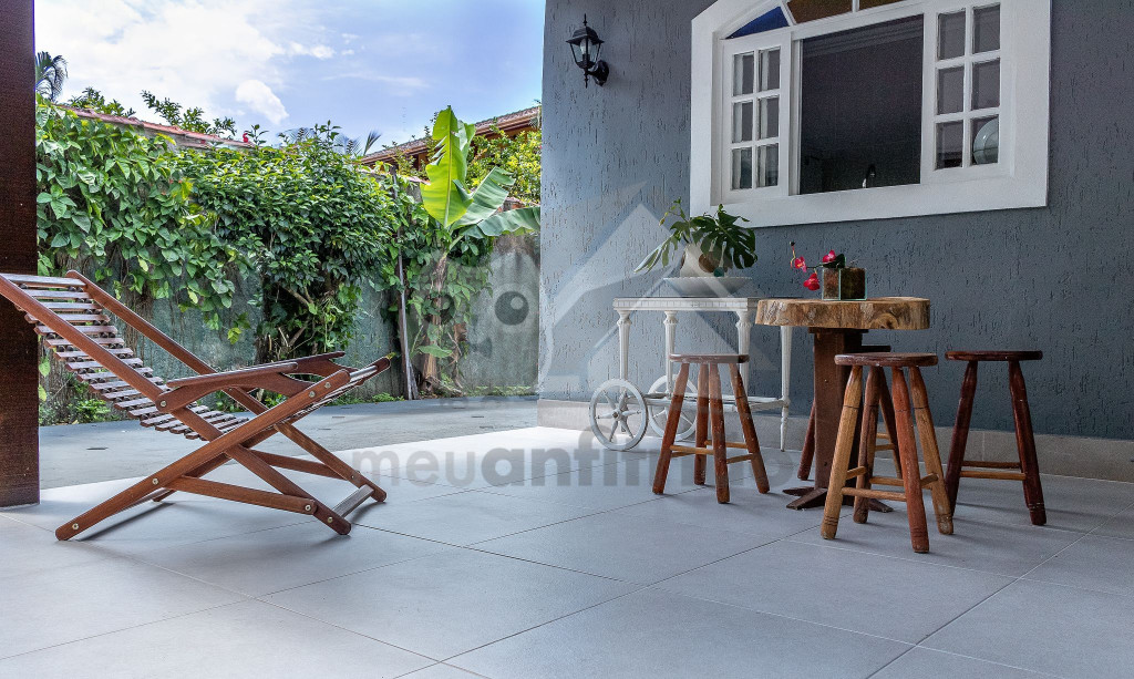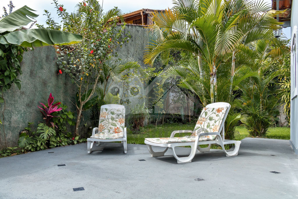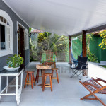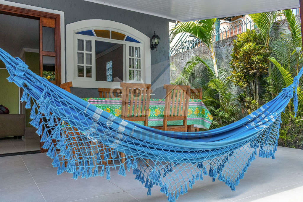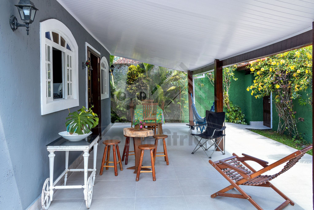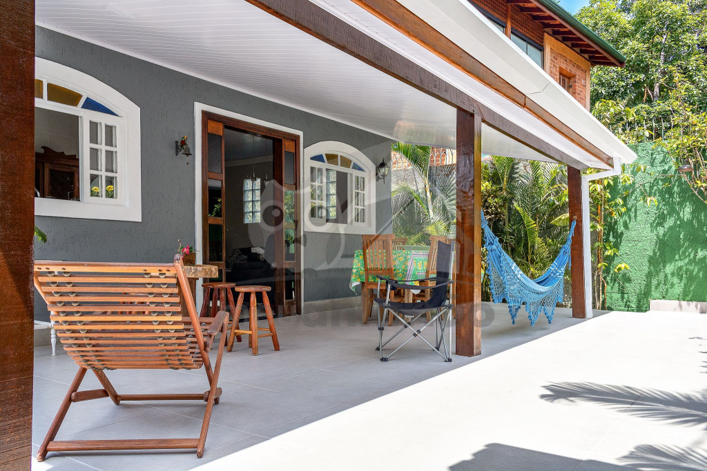 Logo ao entrar na casa, o hóspede terá acesso uma varanda aconchegante com espreguiçadeiras, redes e mesa.