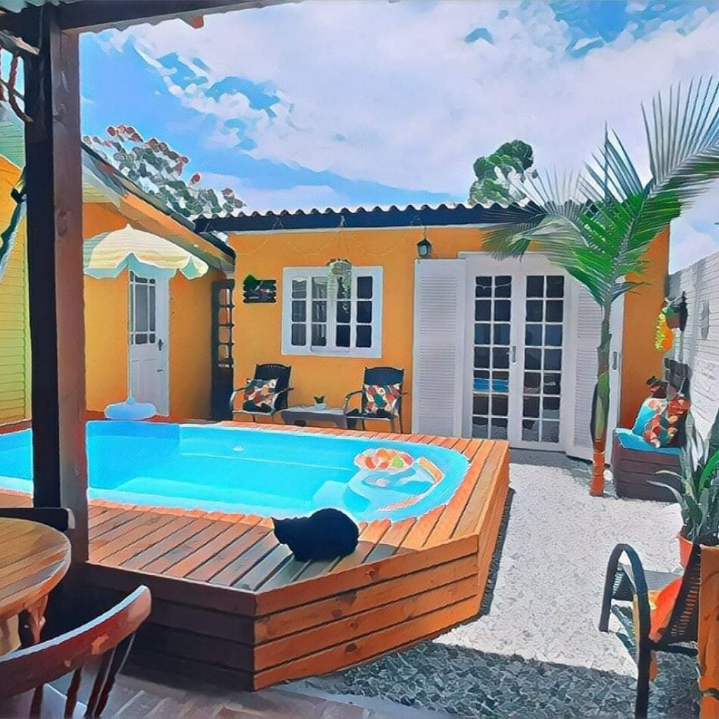 Uma casinha pequena e simples mas completinha para passar férias ou diárias. Quintal piscina churrasqueira e lavanderia compartilhados. Estacionamento.