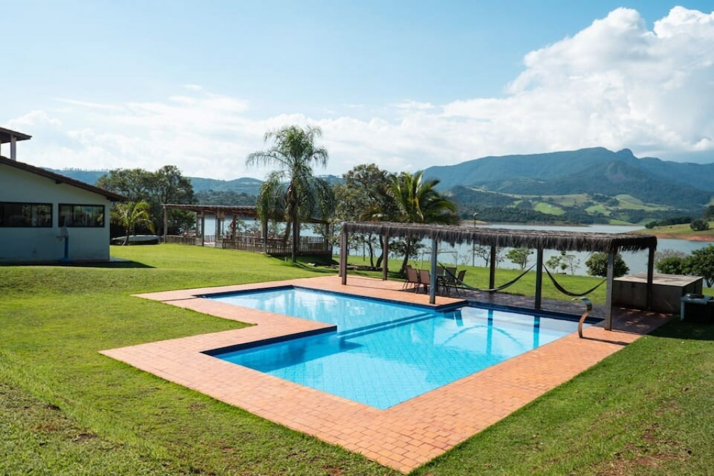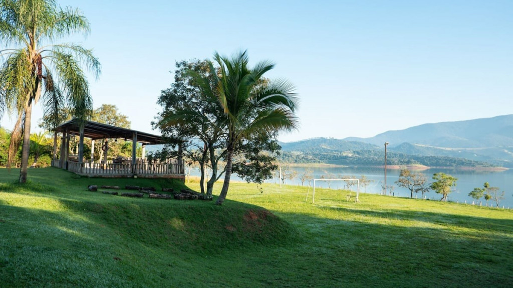 Linda chácara de 22 mil metros, com bastante espaço e muito divertimento para todos, com CAMPO DE FUTEBOL SOCIETY, QUADRA DE VÔLEI (gramado), CESTA PARA BASQUETE, ACADEMIA, PISCINA, SAUNA, RAMPA PARA BARCO e um lindo e aconchegante pergolado com uma vista exuberante para a represa.