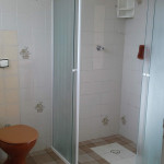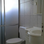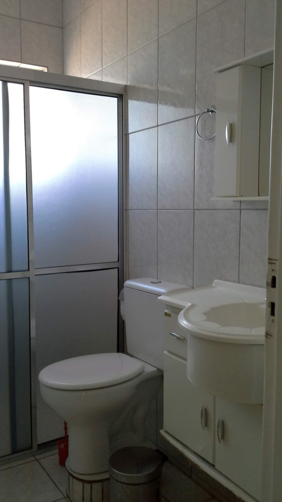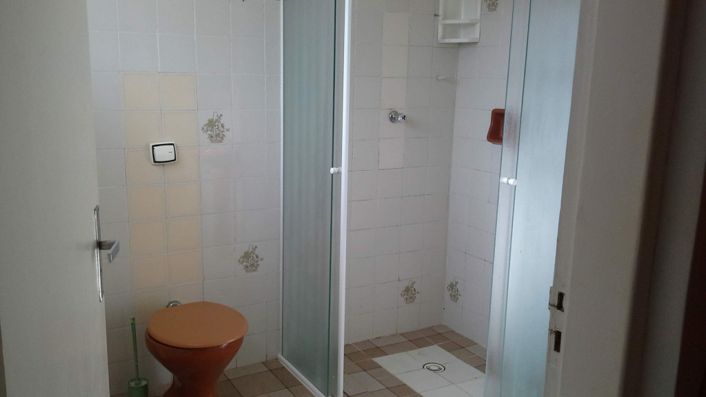 • 1 banheiro na área interna (área comum da casa) e um na área da churrasqueira (muito próximo da piscina e da sauna, com ducha do lado de fora)