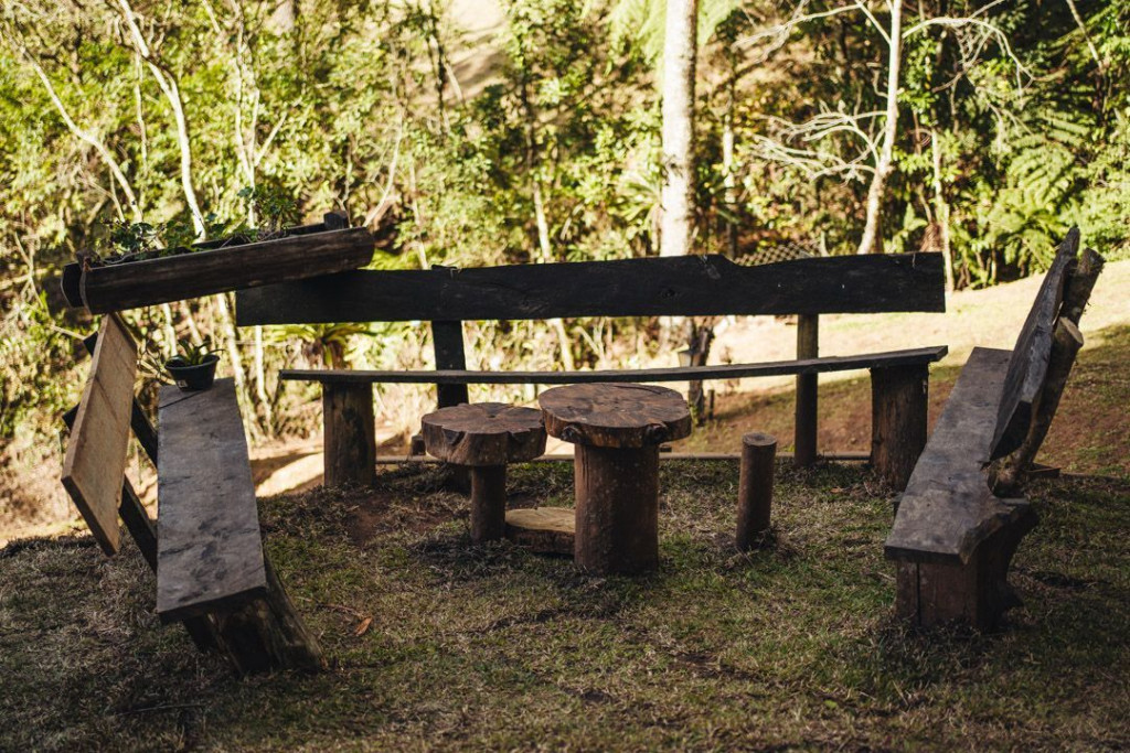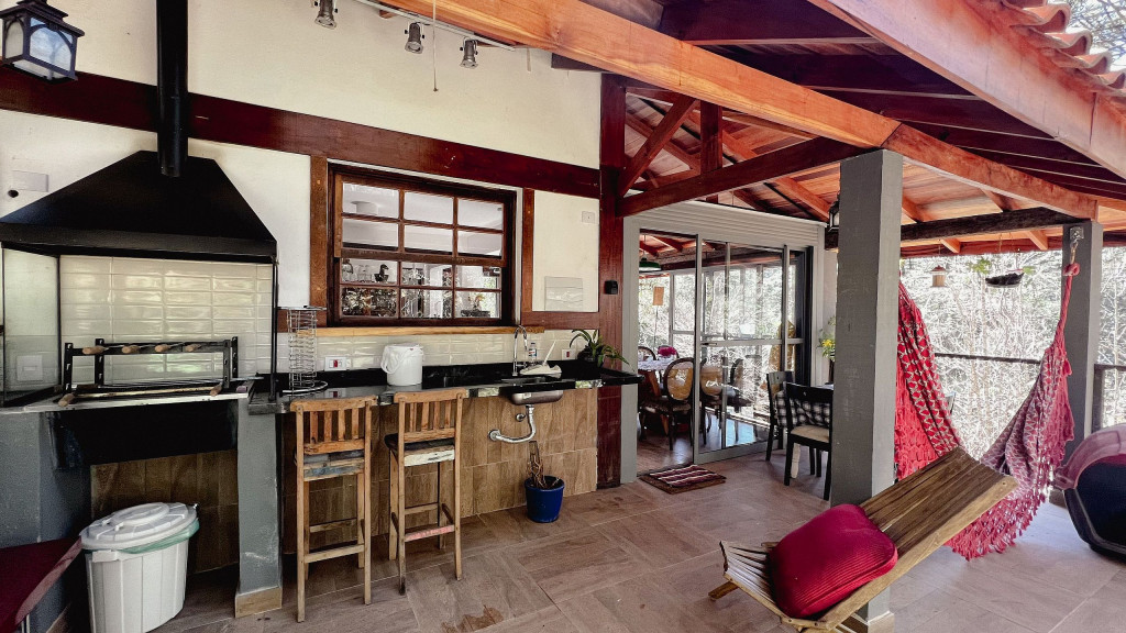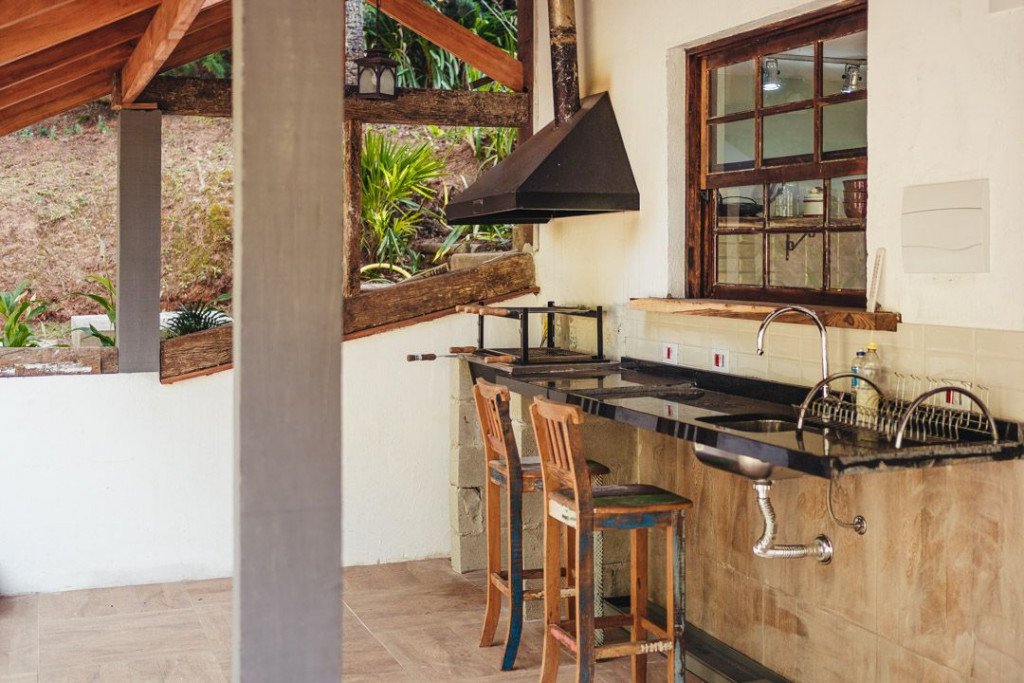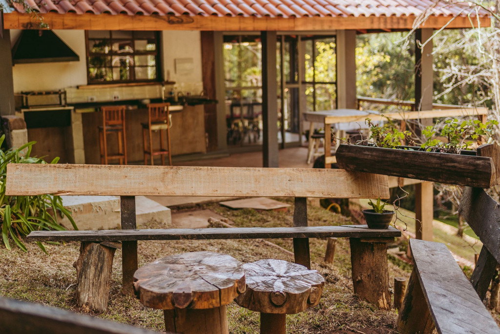 Na área externa, também possuímos uma churrasqueira coberta e bancos ao ar livre para aproveitar um dia ensolarado ou apreciar um vinho no pôr-do-sol.