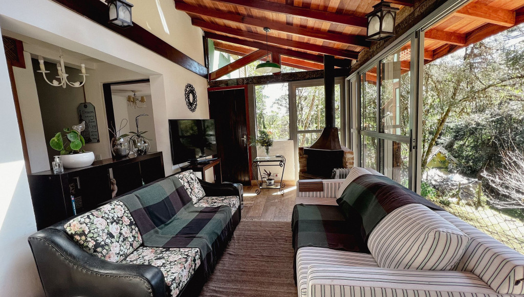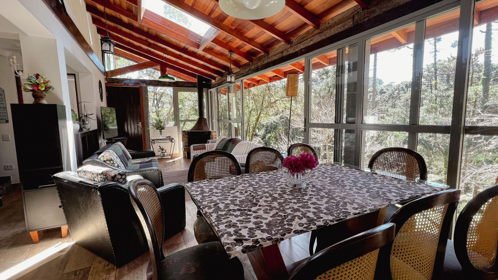 O local é silencioso e seu maior charme é toda a natureza que rodeia sua linda sala de vidro com lareira aconchegante e vista para bosque de araucárias.