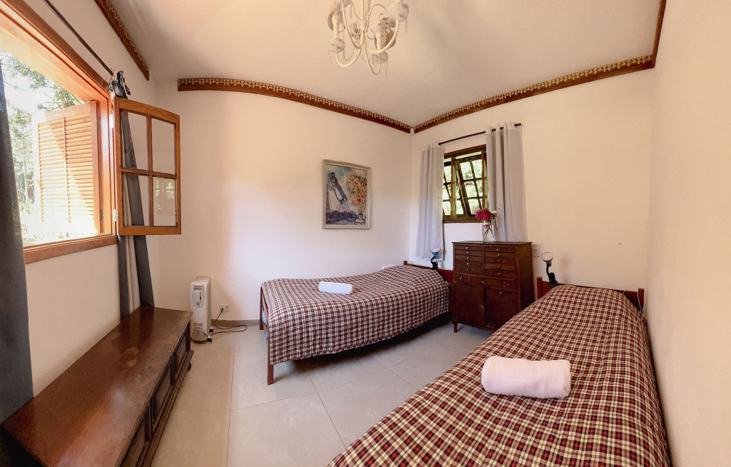 O nosso chalé acomoda até 6 pessoas em três quartos, sendo: dois quartos com cama queen e outro com 2 camas de solteiro. Todas as camas possuem lençol térmico, aquecedor, cobertor, edredom, travesseiros e também oferecemos toalhas de banho.