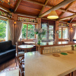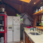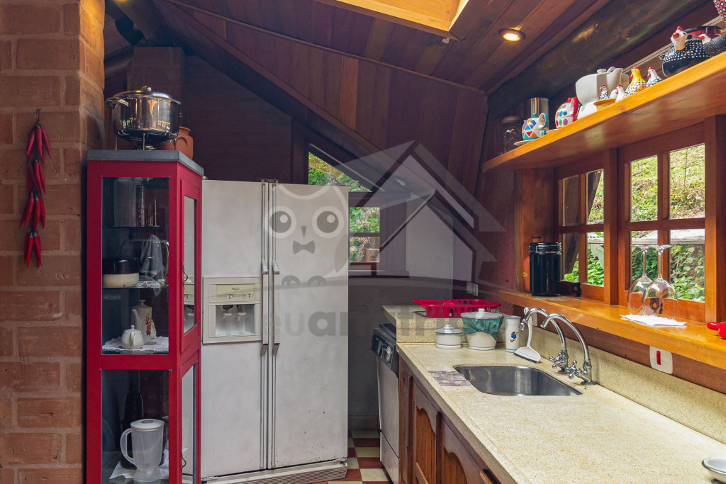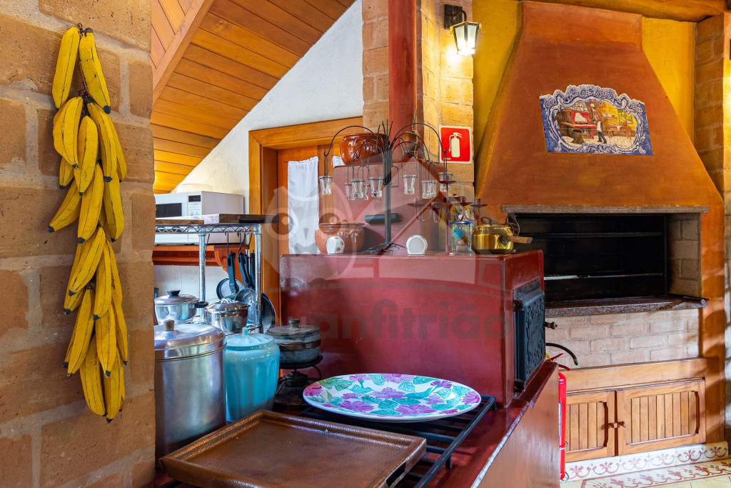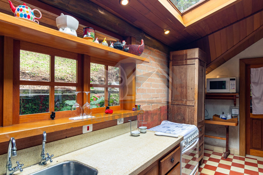 Em frente a este espaço, temos uma cozinha completa com os utensílios necessários para a estadia. O local é ideal para aproveitar os dias em família ou amigos que podem estar hospedados nos outros chalés.