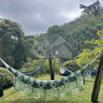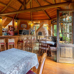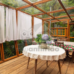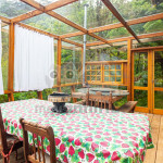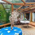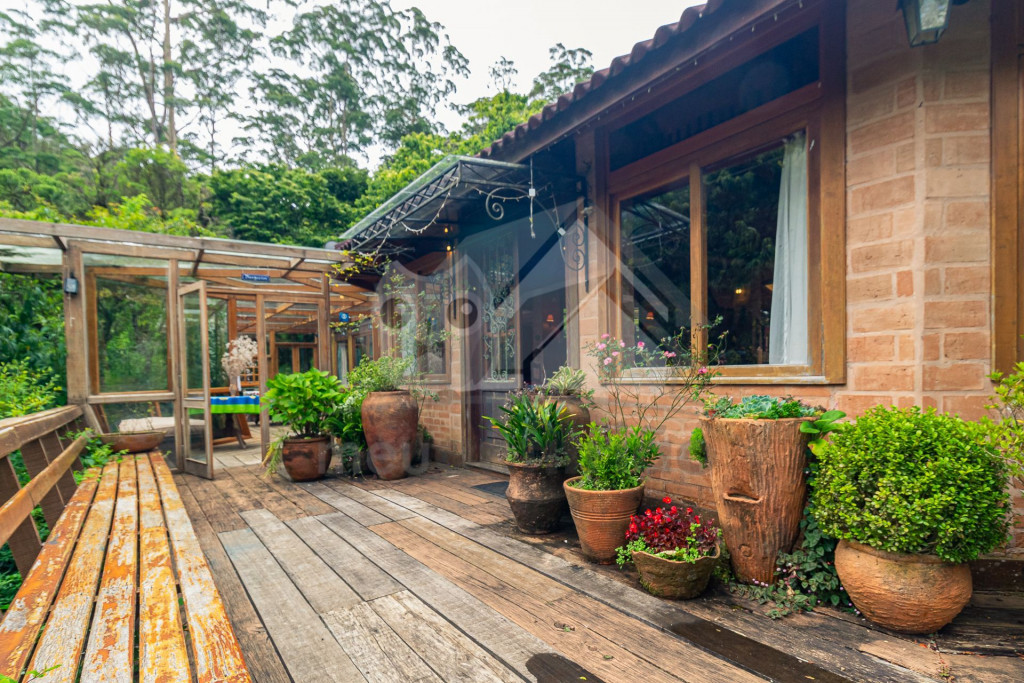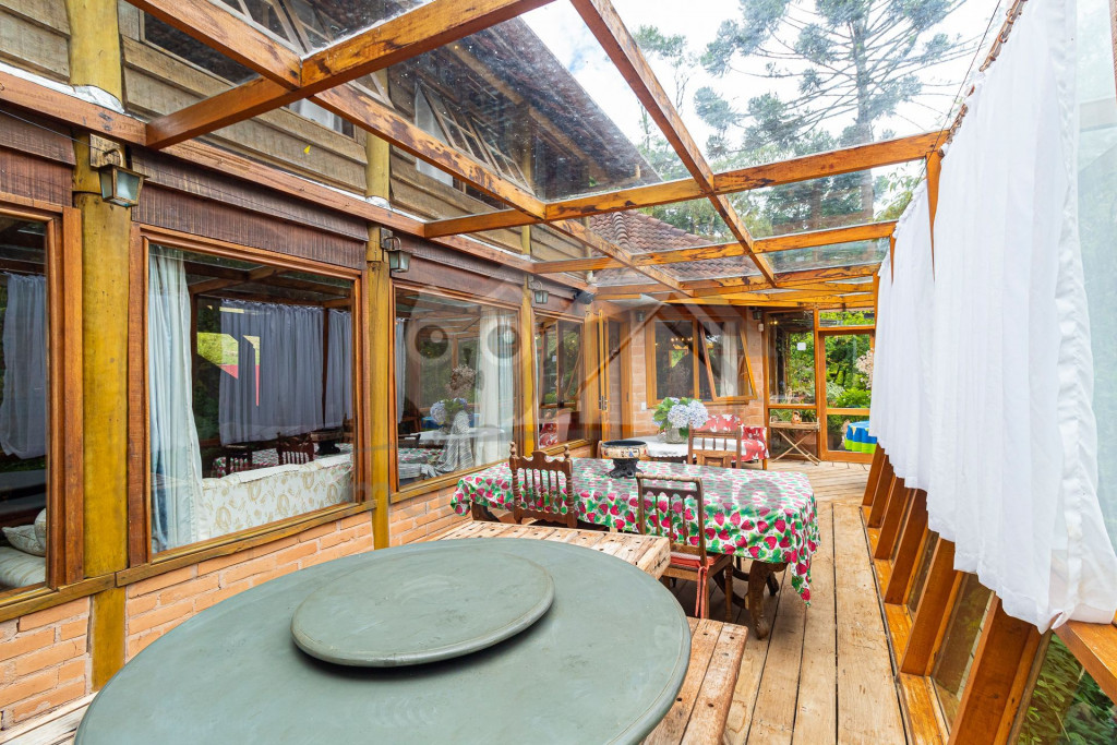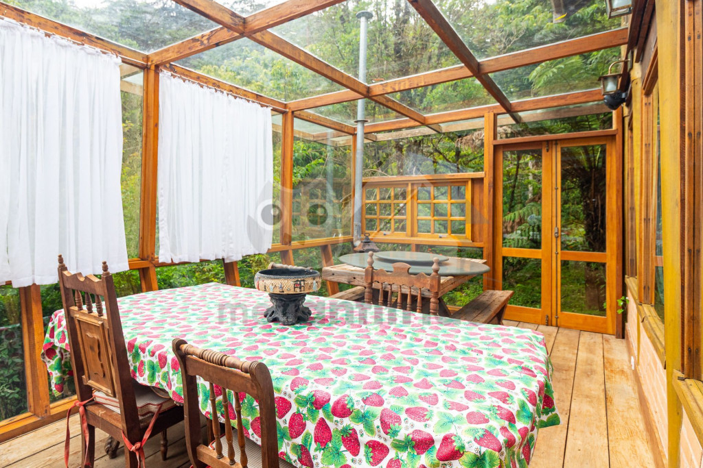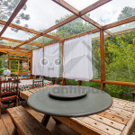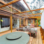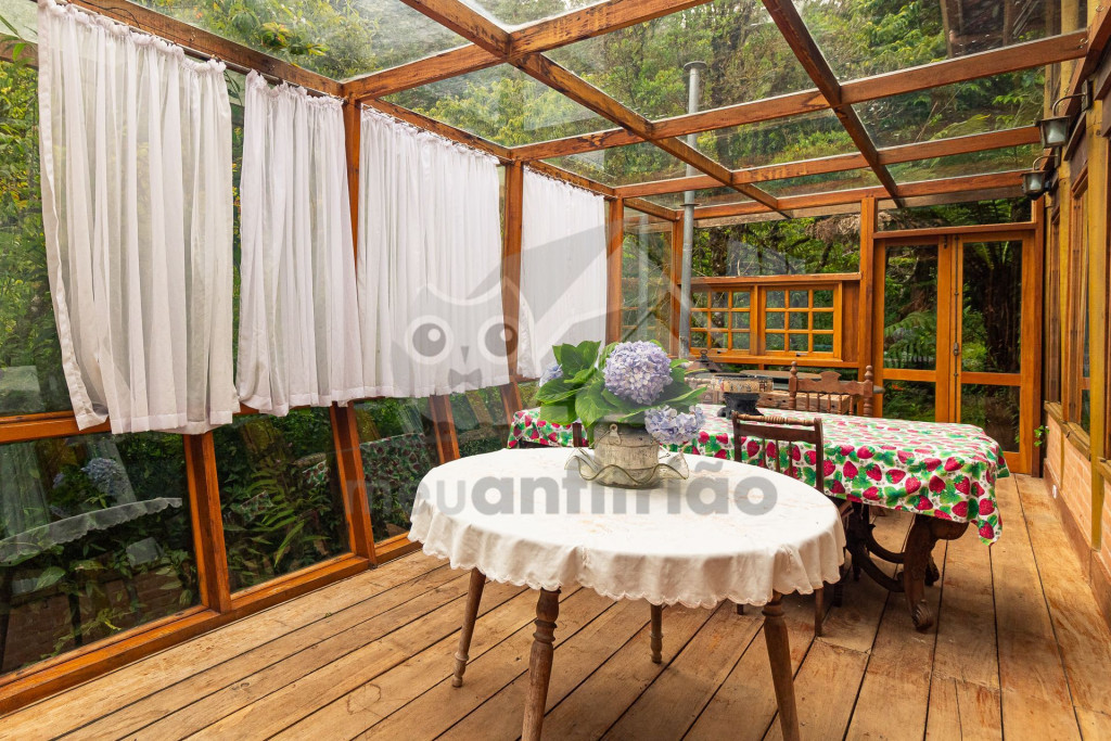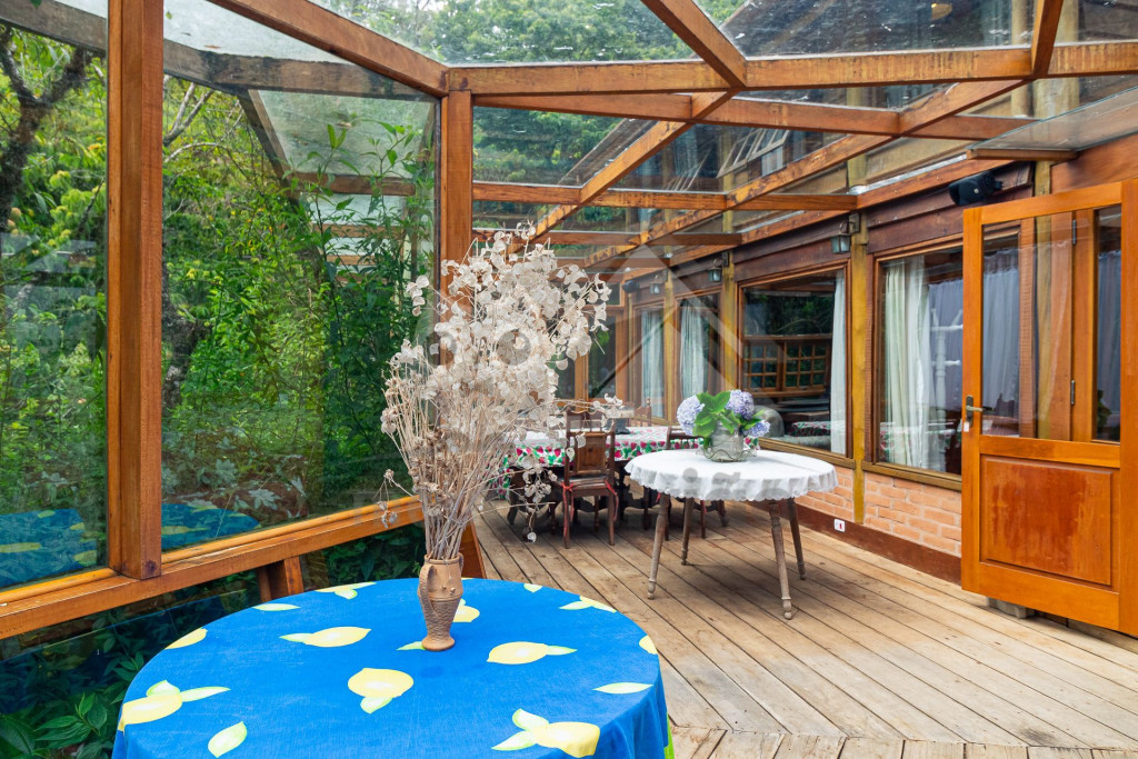 Existe uma porta em frente ao lavabo que dá acesso a área externa coberta e toda envidraçada. O ambiente faz divisa com a mata. O local também possui mesas e cadeiras para apreciação da vista.