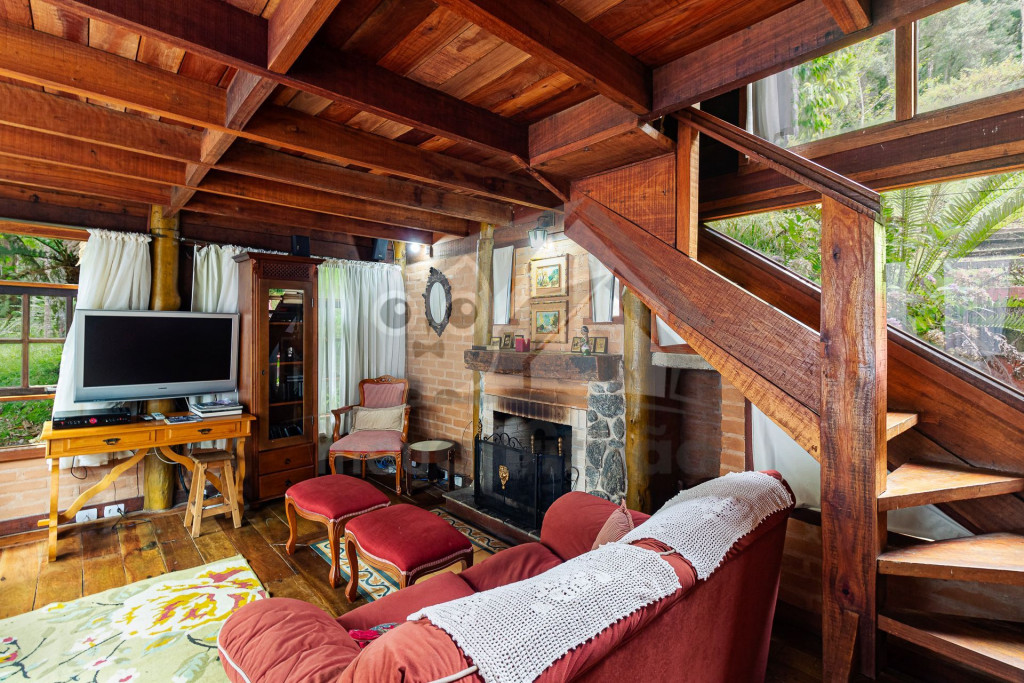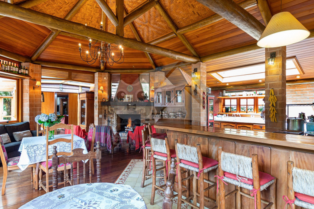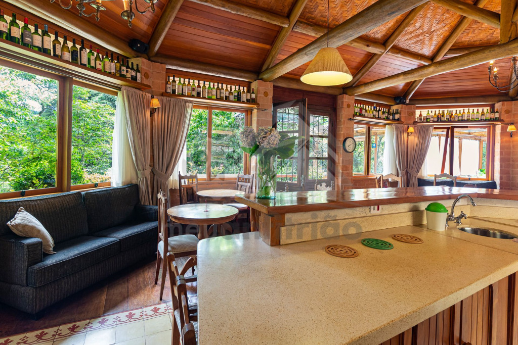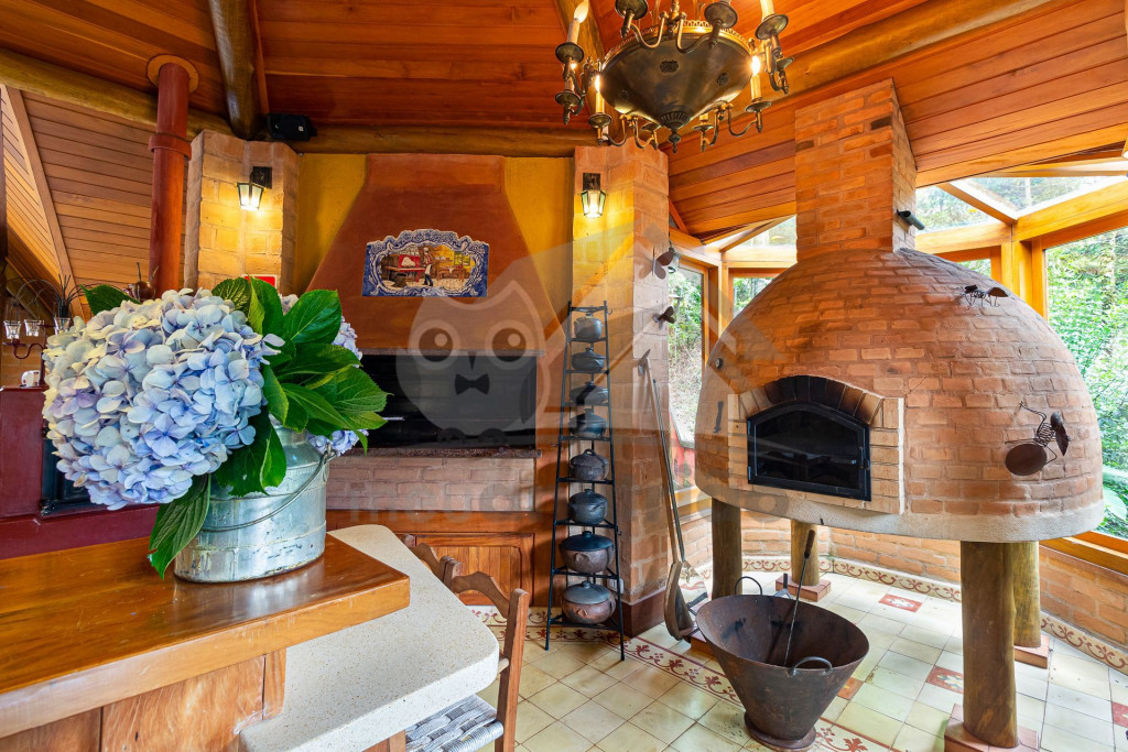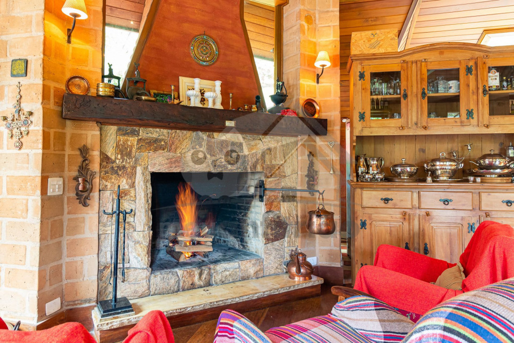 Logo ao entrar no chalé, o hóspede terá acesso a uma sala com lareira, poltronas, mesas, churrasqueira, forno de pizza e fogão à lenha.