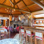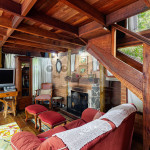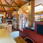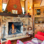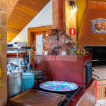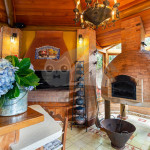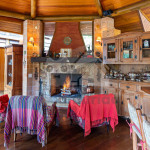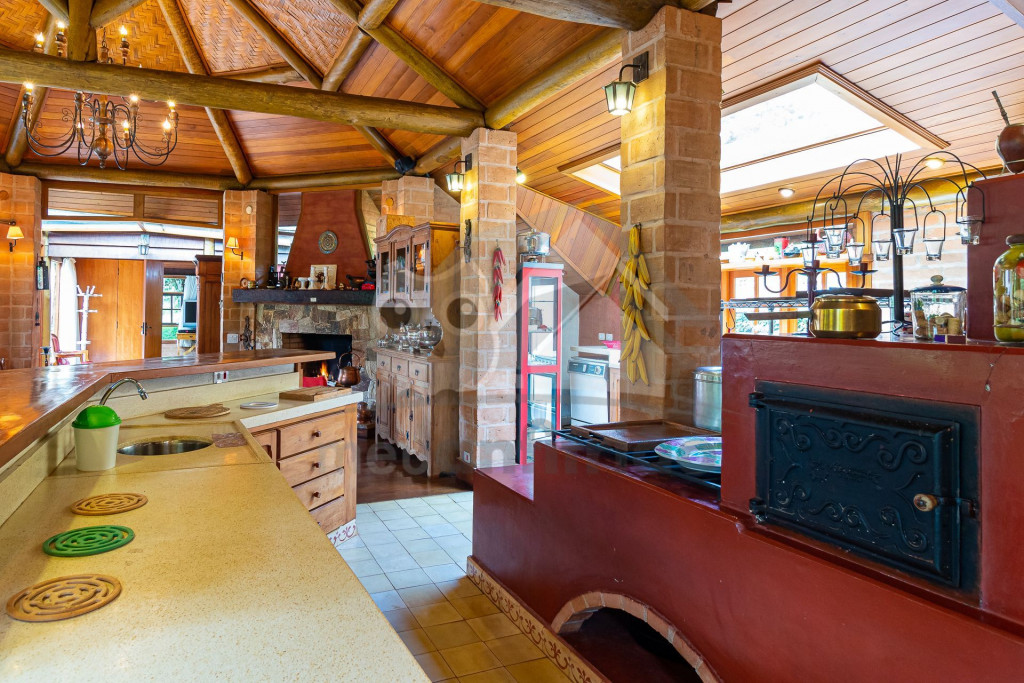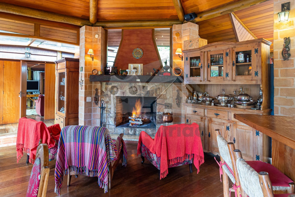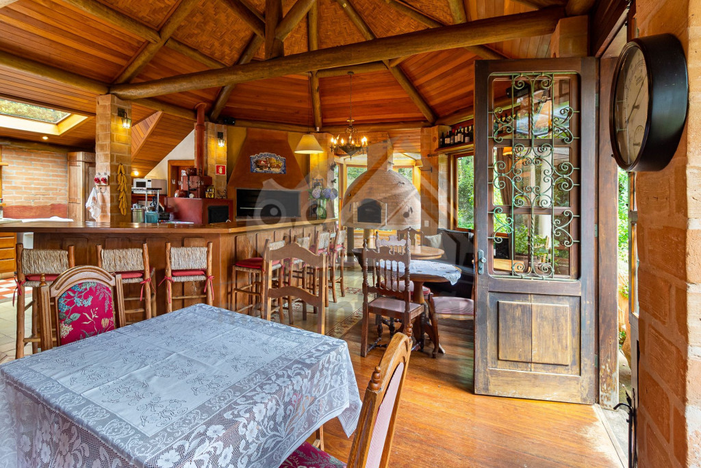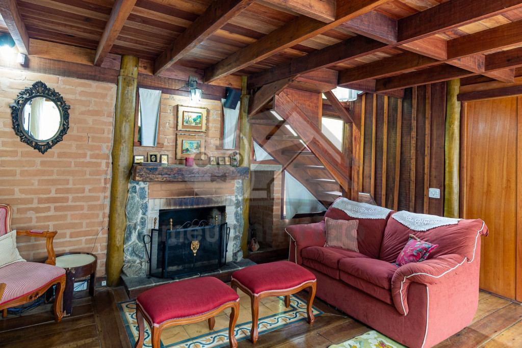 Logo ao entrar no chalé, o hóspede terá acesso a uma sala com lareira, poltronas, mesas, churrasqueira, forno de pizza e fogão à lenha.