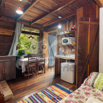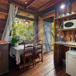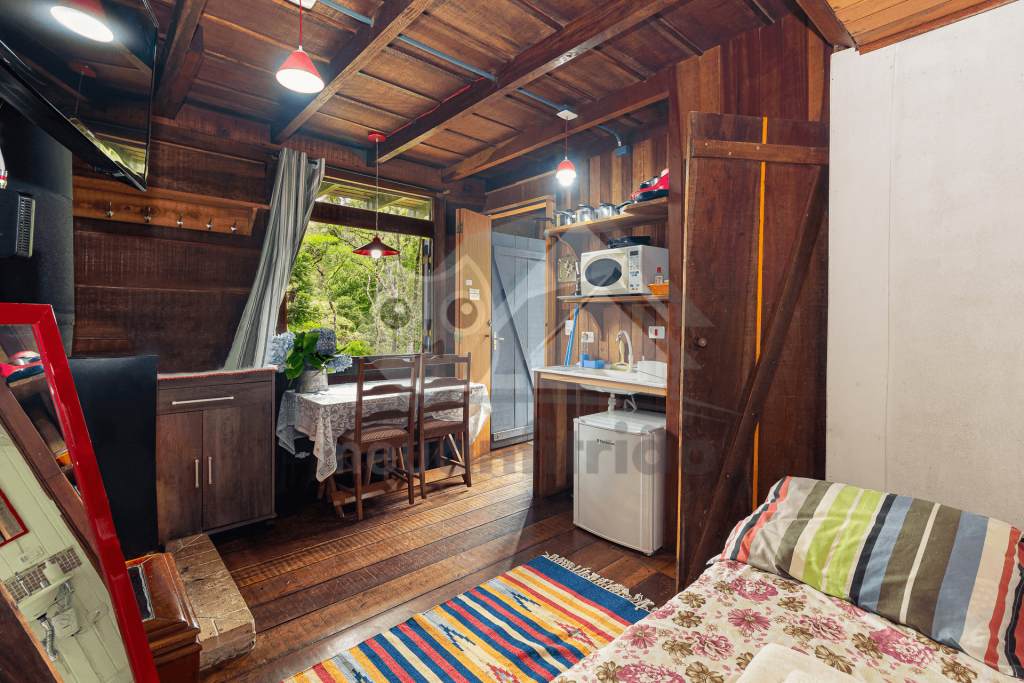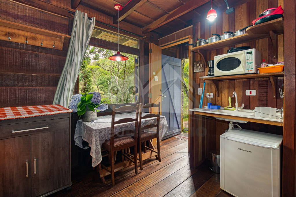 Logo ao entrar no chalé, o hóspede terá acesso a um espaço com uma pequena cozinha, mesa para refeições, cama de casal e TV. A cozinha contém os utensílios básicos para o dia-dia da estadia e um cooktop elétrico para preparo de pequenas refeições.