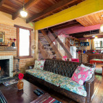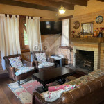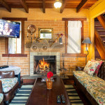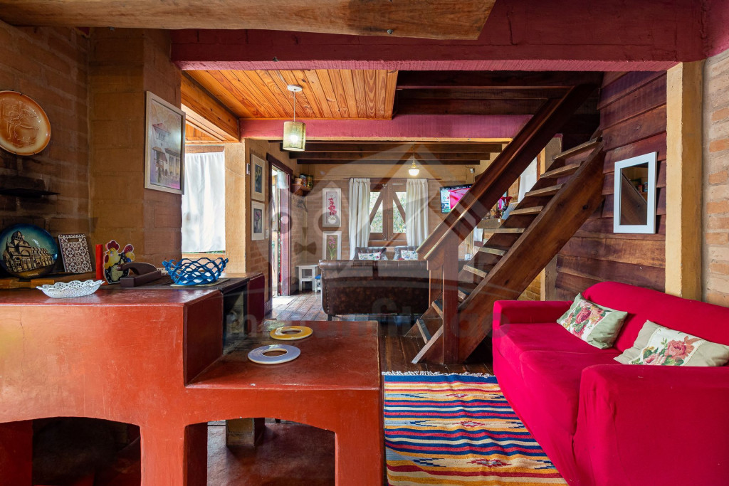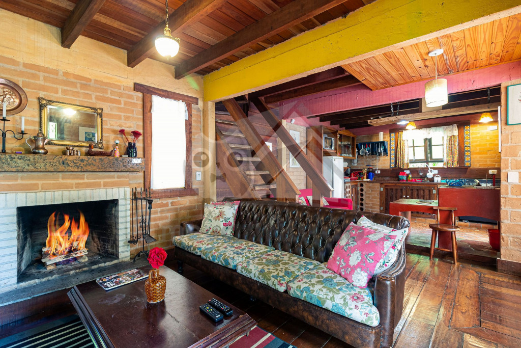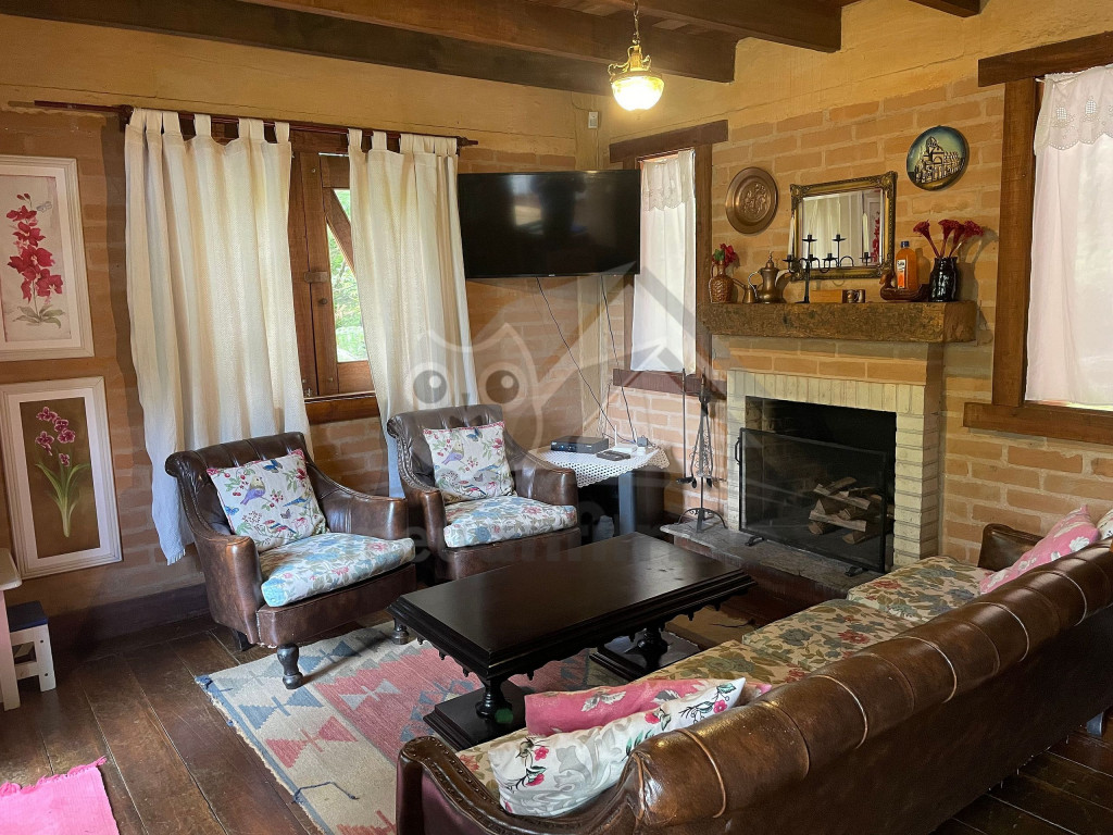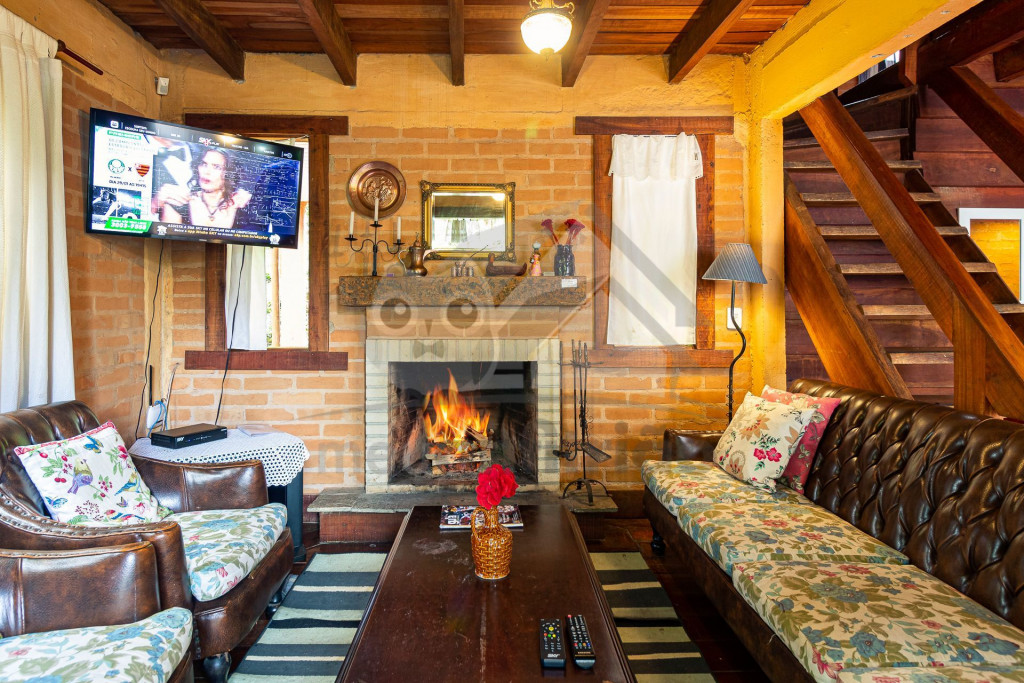 Logo ao entrar no chalé, o hóspede terá acesso a uma sala com TV a cabo, sofá, poltronas e lareira.