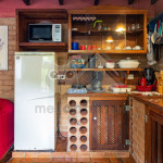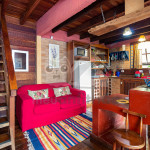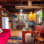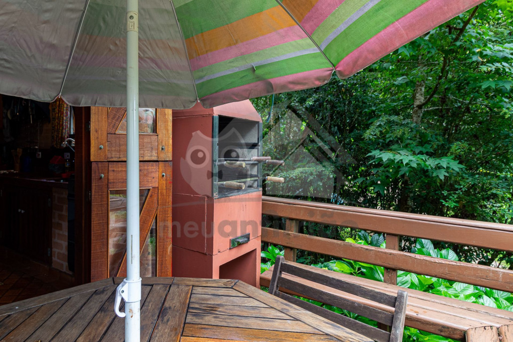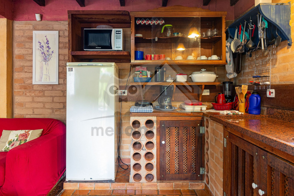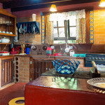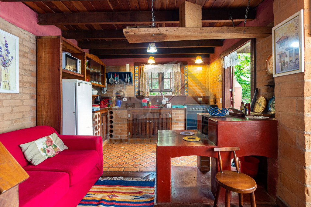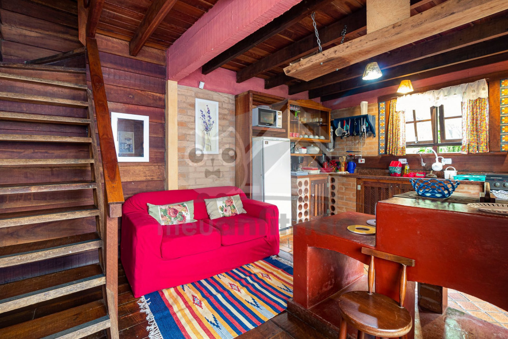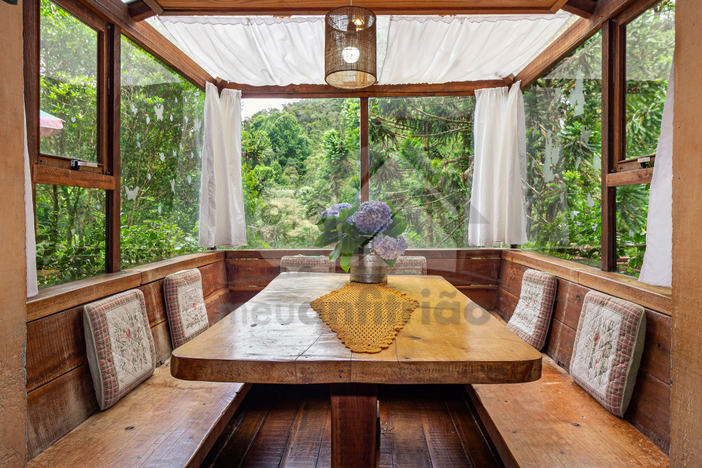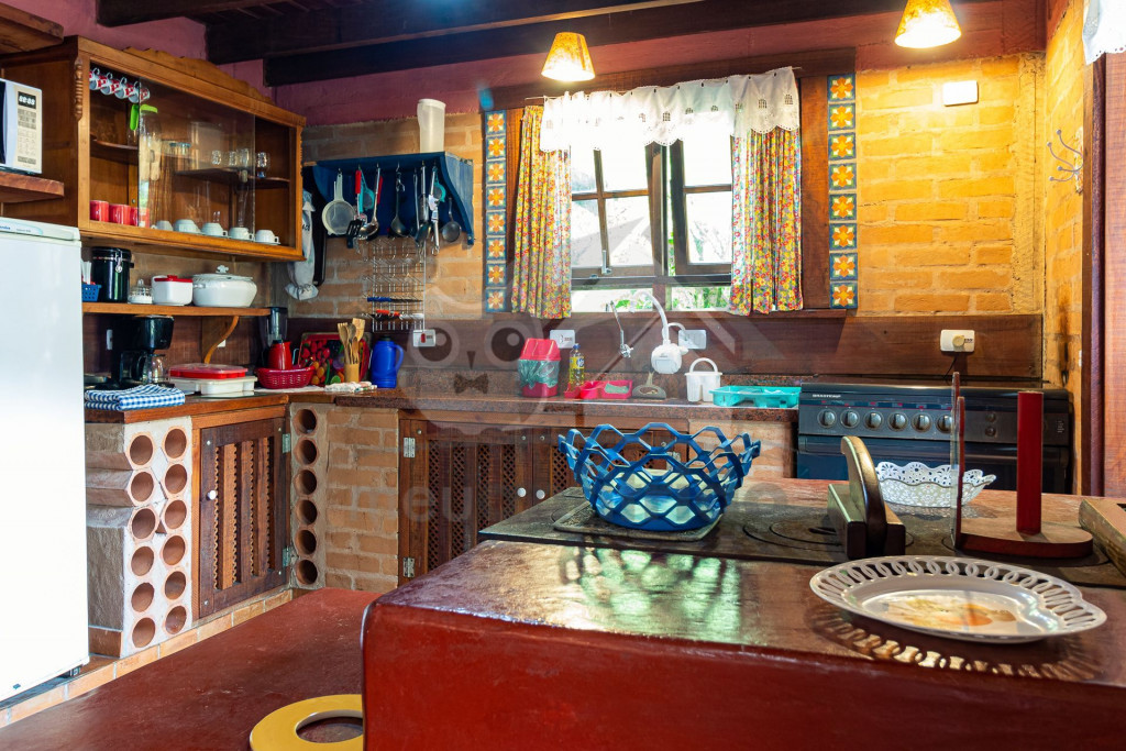 Ao lado temos a cozinha com utensílios necessários para a estadia e fogão à lenha. Nesse mesmo espaço, temos sala de jantar com bancos toda envidraçada.
