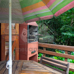 Saindo pela porta da cozinha, temos um terraço com churrasqueira e mesas com vista para a área externa.