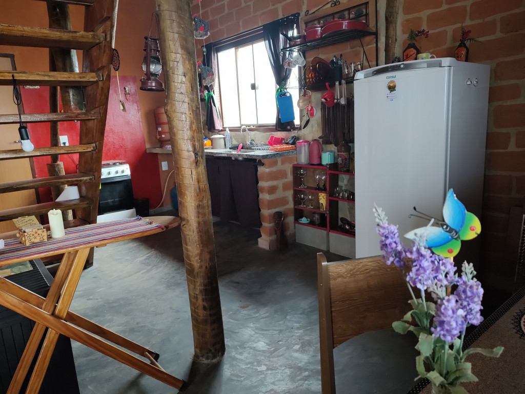 A cozinha é bem equipada para fazer suas refeições. Fogão elétrico, geladeira, filtro de barro.