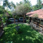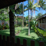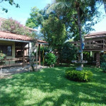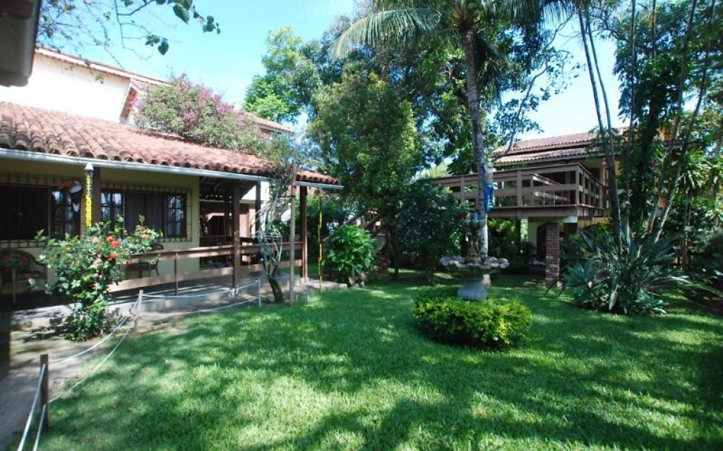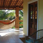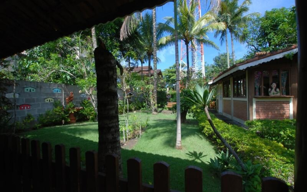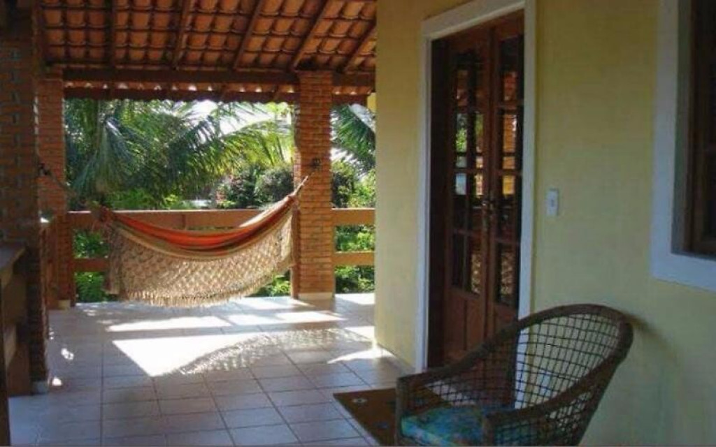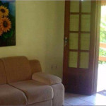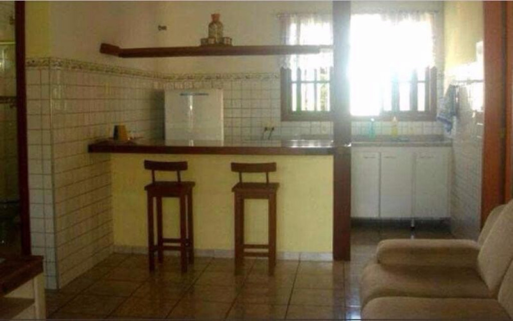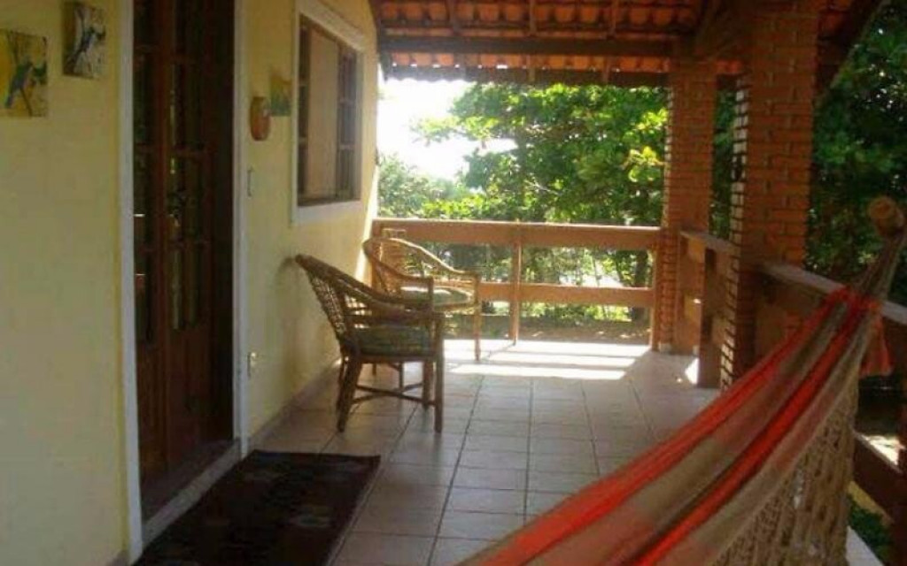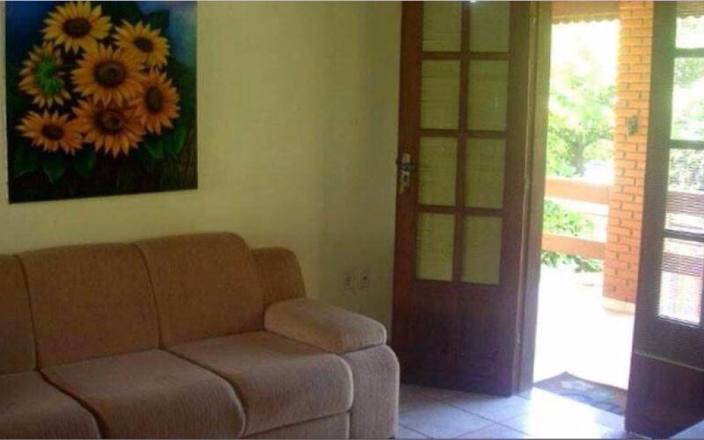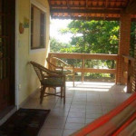 Chalé, com 1 quarto, cozinha, sala, banheiro, varandão e muito verde.