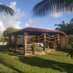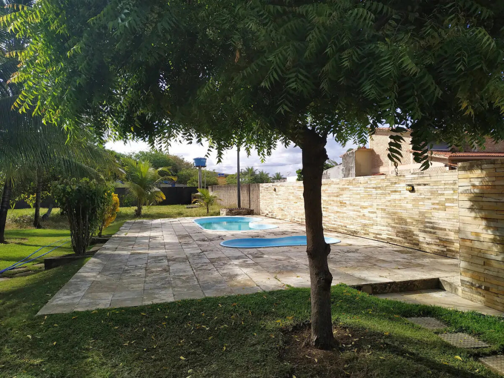 Temos uma ampla área verde com fruteiras, piscina com deck e espreguiçadeiras, área coberta com churrasqueiras e mesas.