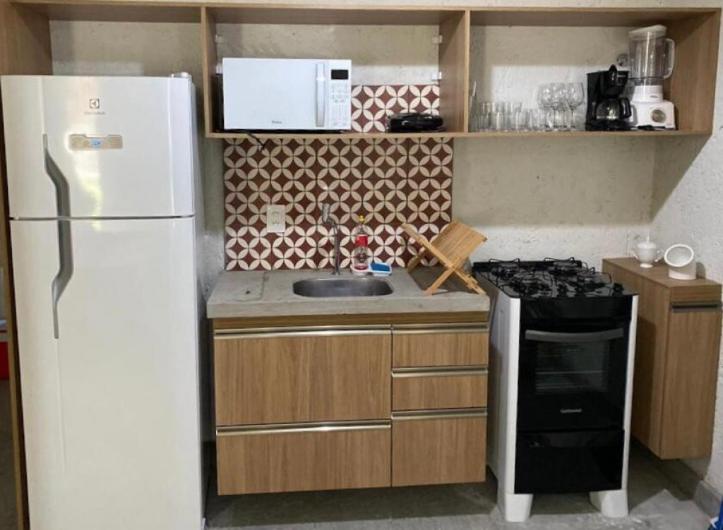 ????Cozinha completa (geladeira, fogão, microondas, cafeteira, liquidificador, sanduicheira, copos, taças, pratos, talheres, panelas, utensílios de cozinha...)