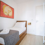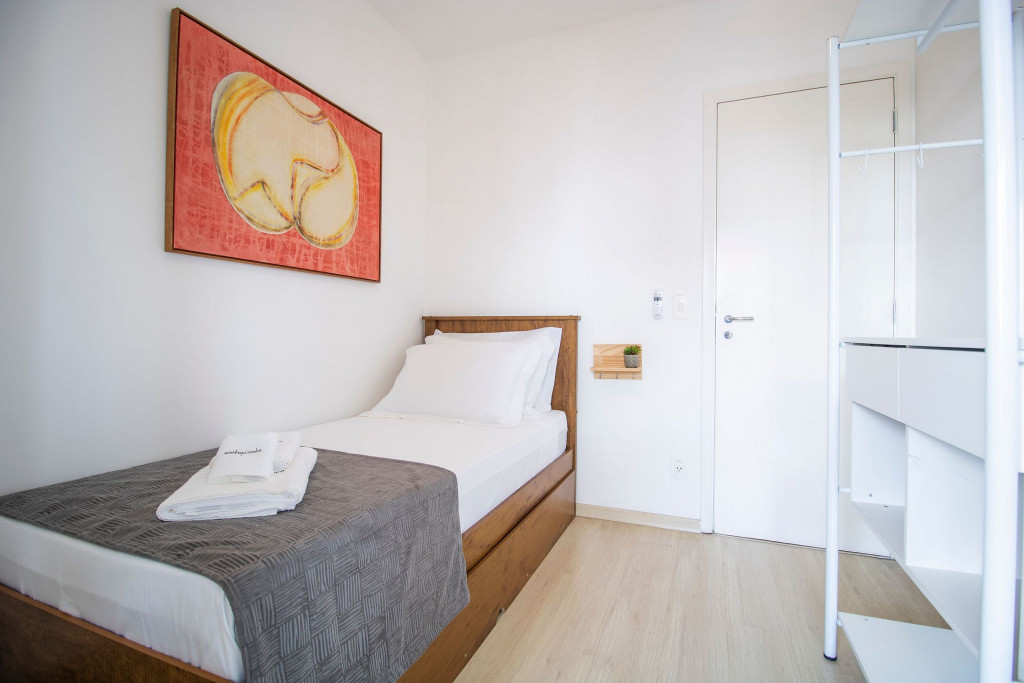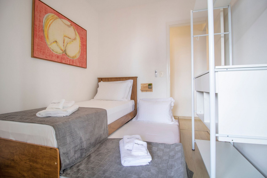 O quarto de casal é aconchegante e tem uma cama tamanho Queen, além de armários planejados com bastante espaço para você guardar todas as suas roupas. As camas têm dois travesseiros, um mais firme (Travesseiro NASA) e um mais macio (pluma de ganso). O banheiro é limpo, e equipado com um bom secador de cabelo e chuveiro a gás de alta vazão. O segundo quarto com uma bi-cama e com um armário. Caso seja necessário, o confortável sofá-cama da sala se tornam mais duas camas de solteiro.