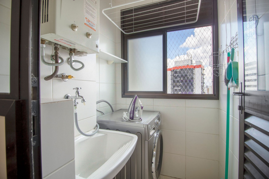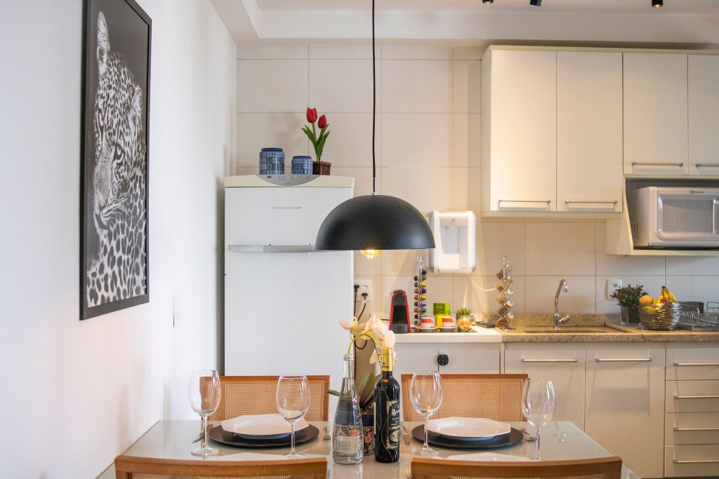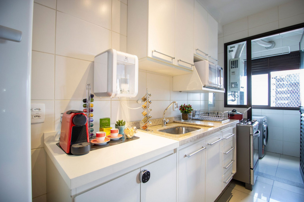 O Apartamento é muito arejado e bem completo com fogão de quatro bocas com forno, geladeira, micro-ondas, filtro de água, e diversos utensílios para cozinhar. A área de serviço, tem uma máquina de lavar e secar, tábua e ferro de passar, e varal. Para a sua segurança, na cozinha há um extintor de incêndio, um kit de primeiros socorros, e um detector de fumaça