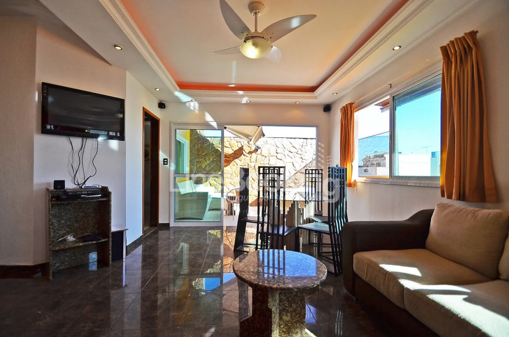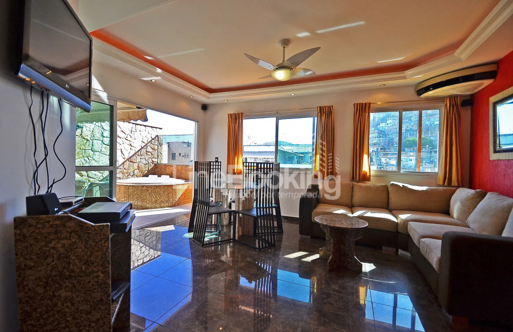 A sala possui de um sofá e mesa de jantar. Cobertura de luxo em Copacabana – Rio com três TVs LCD, TV a cabo, Internet sem fio e cofre, já incluido no preço. Um lindo terraço com hidromassagem completar sua estadia. Localizado no 12° andar de um prédio seguro com portaria 24hs. Apenas 150 metros até a famosa praia de Copacabana.