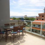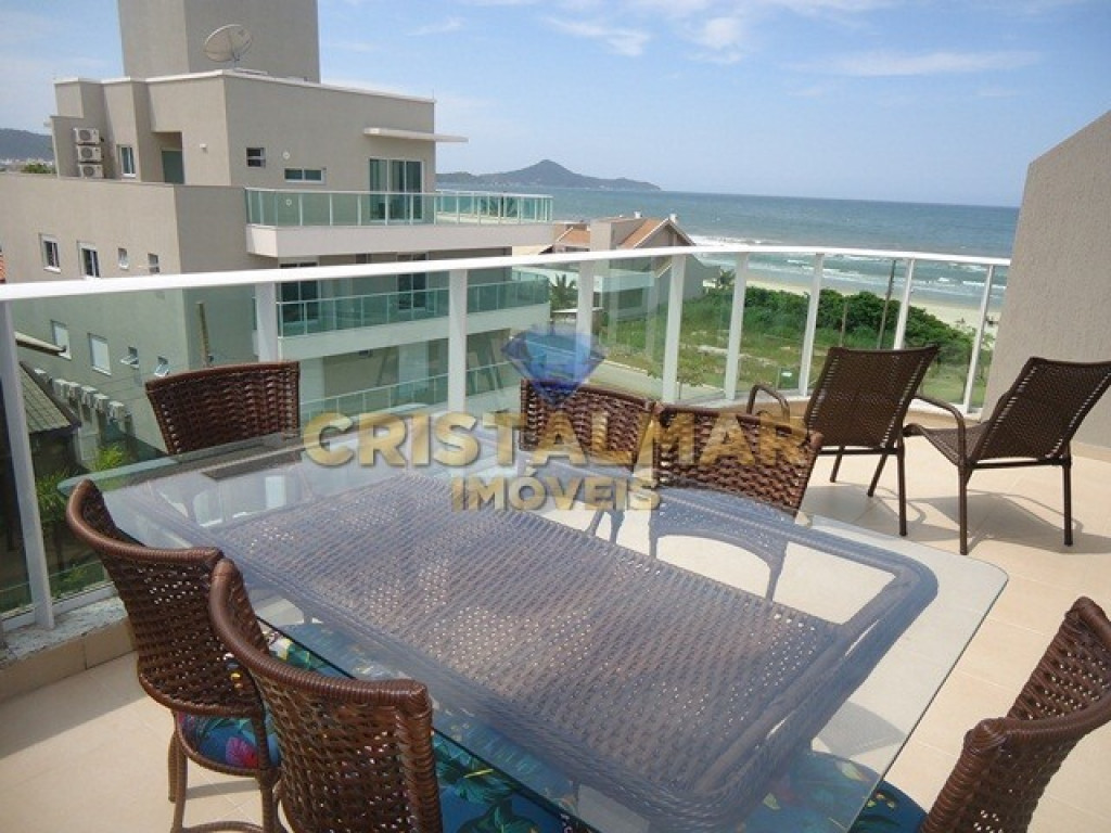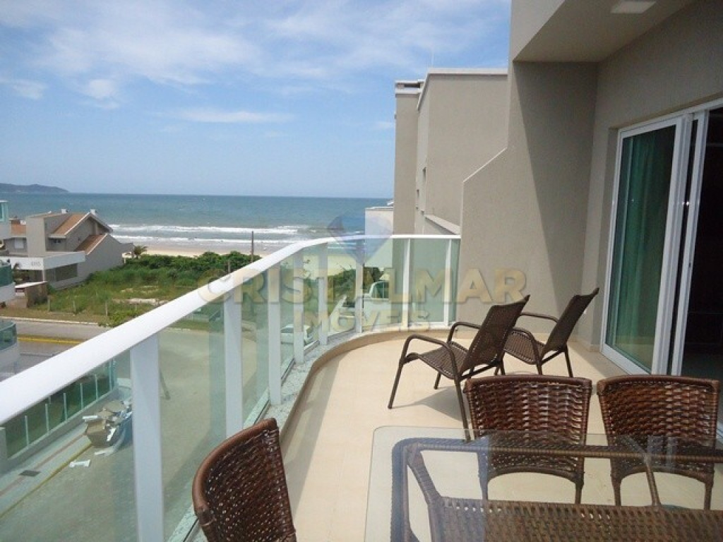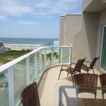 Sacada com vista para o mar, mesas e cadeiras para área externa com vista para o mar;