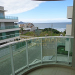 Sala de estar com TV, ar condicionado e sacada com vista para o mar;