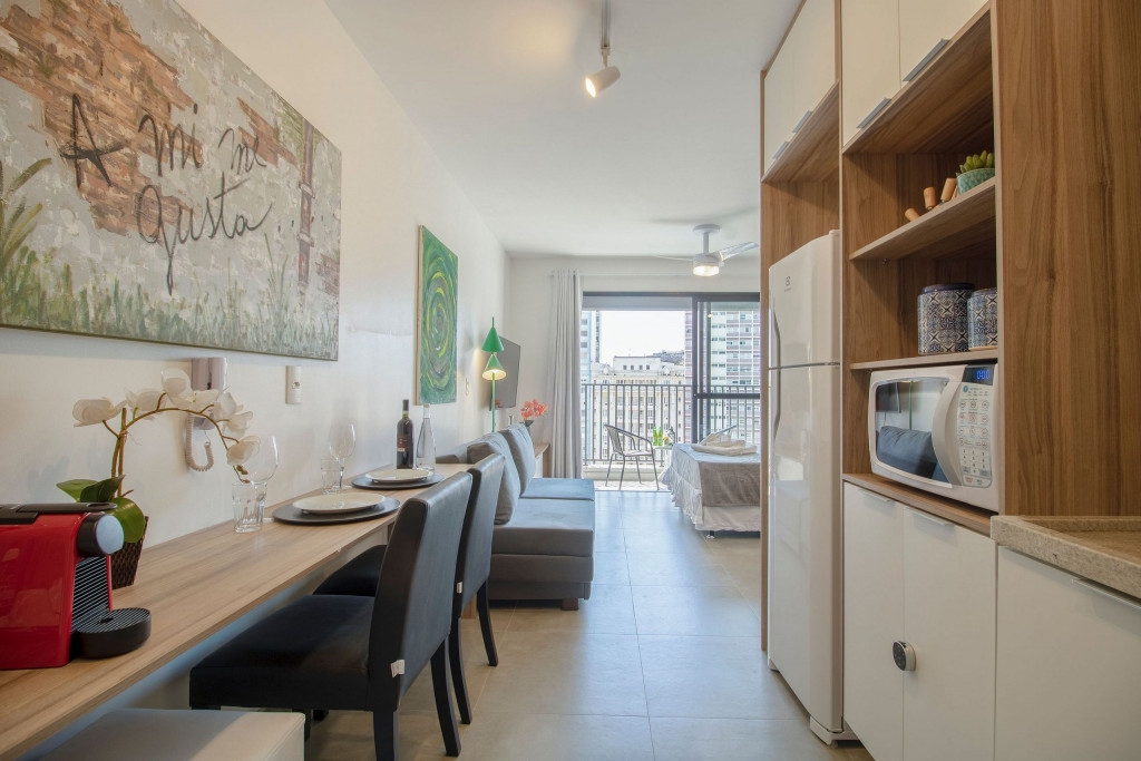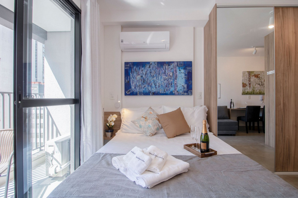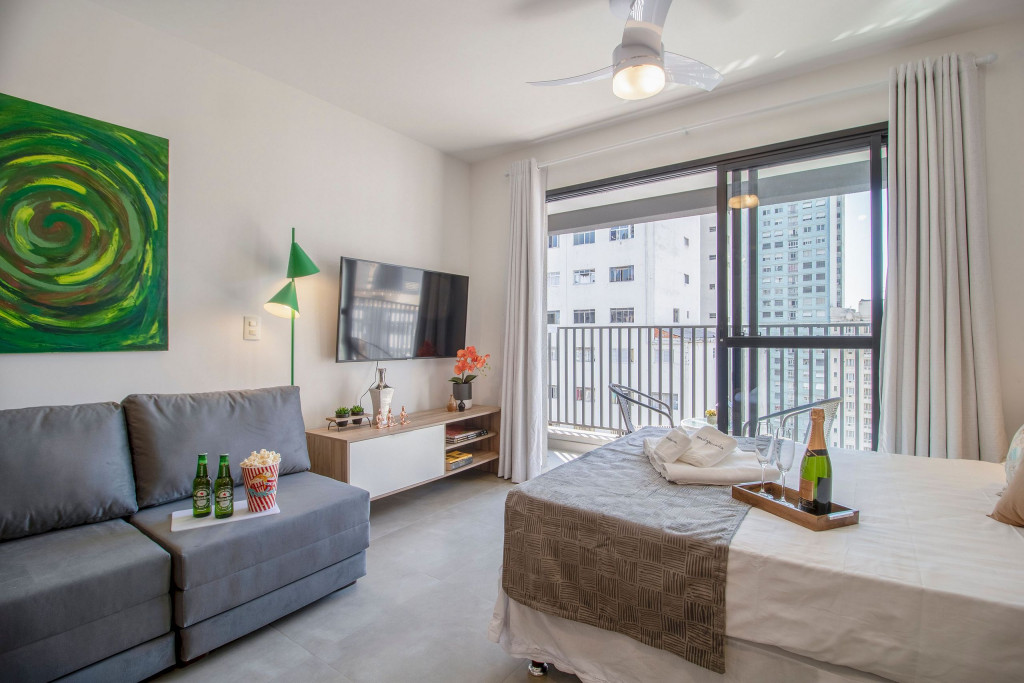 O estúdio de 30m² fica próximo ao metrô da República (estação integrada com a linha 3-Vermelha e linha 4-Amarela), ele oferece o espaço ideal para uma estadia confortável na cidade de São Paulo. Ele conta com SmartTV de 50", ar condicionado, cortina blackout, internet ultra-veloz, cozinha completa com cafeteira Nespresso, banheiro com secador de cabelo e um ótimo chuveiro a gás. O edifício disponibiliza piscina, academia, sauna, lavanderia e vaga de garagem para a sua comodidade.