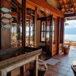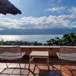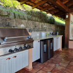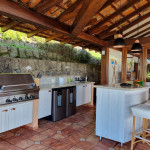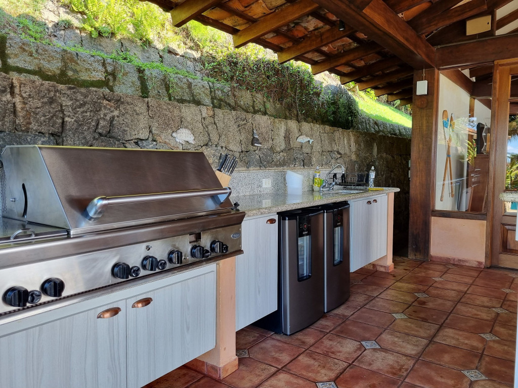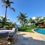 Ao sair pela porta da sala, dispomos de uma varanda com vista para o mar, churrasqueira, mesas e um amplo jardim com piscina.