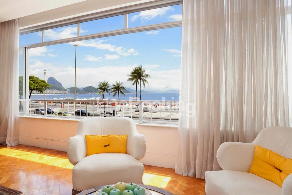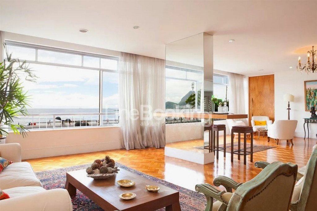 Com uma vista completa e deslumbrante para a praia de Copacabana, este apartamento apresenta um enorme salão composto por 3 ambientes acolhedores e confortáveis onde encontram-se uma sala de TV, uma sala de estar central e uma sala de jantar com lindas portas de correr, caso queira mais privacidade.