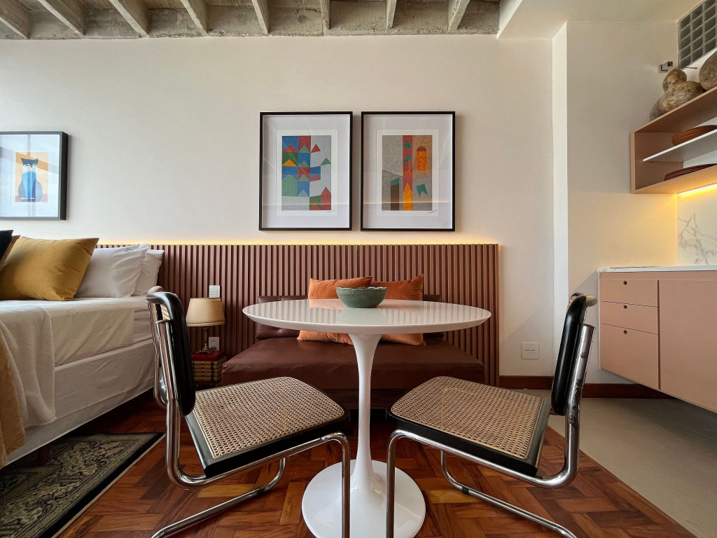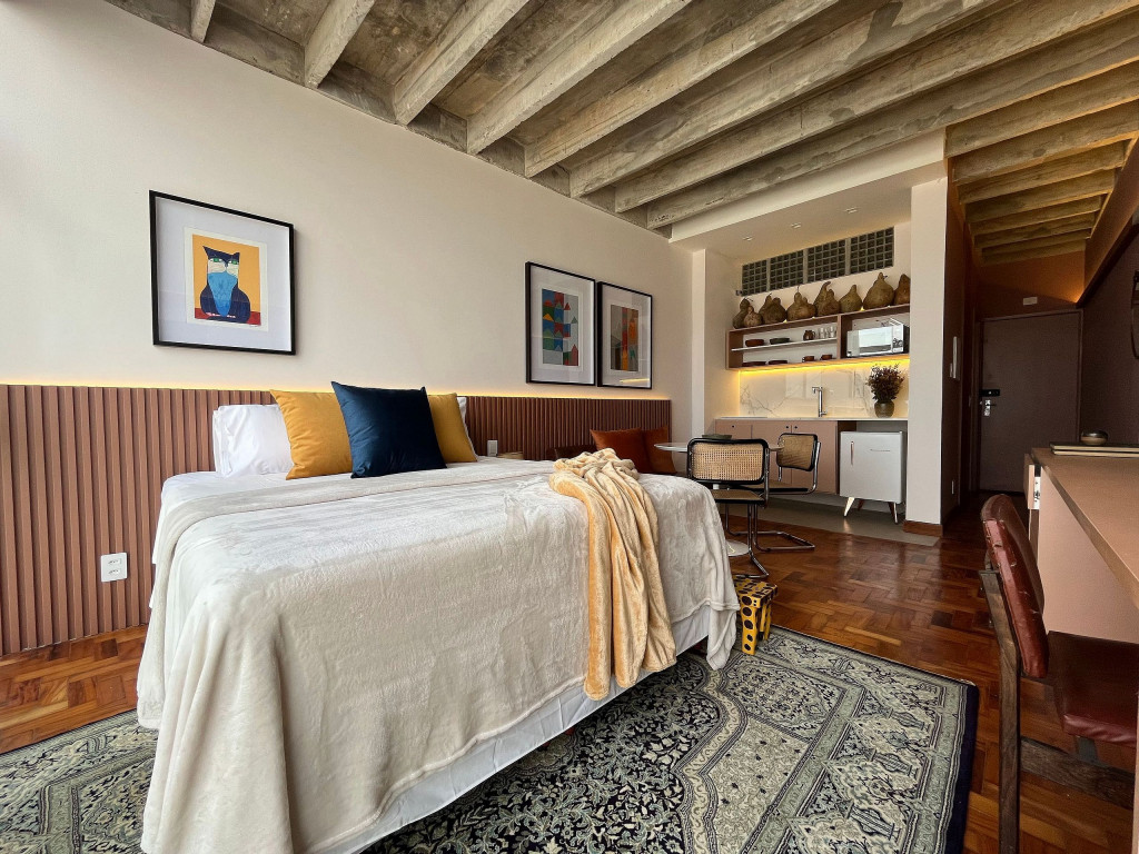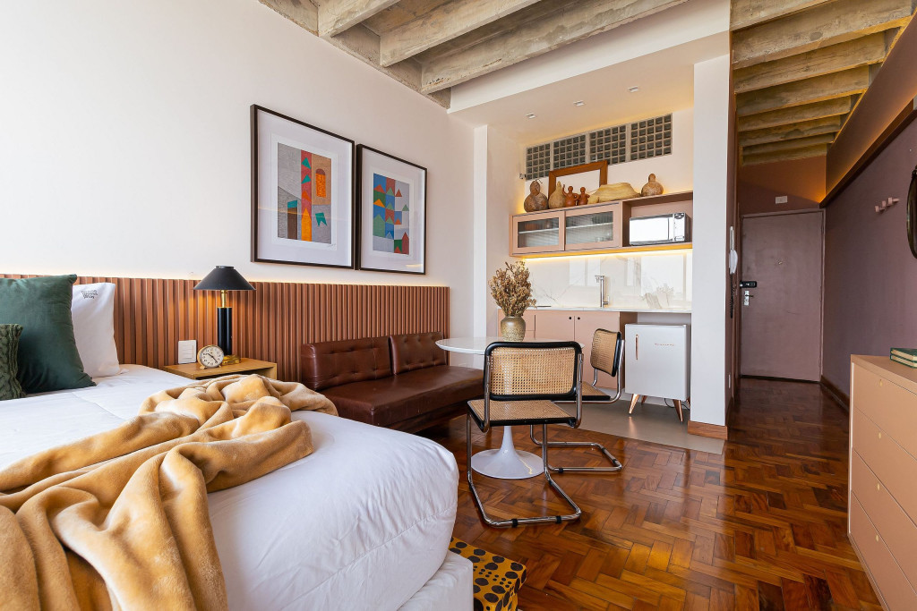 Apartamento de conceito aberto, com todo o conforto que você precisa: cama Queen, Smart TV em uma decoração acolhedora e funcional.