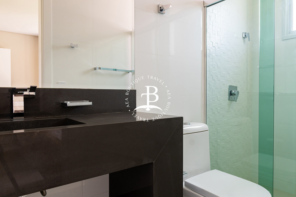 As comodidades extras incluem, ‘internet’ Wi-Fi como cortesia (sujeito a oscilações e indisponibilidade), sistema de alarme e câmara de segurança, lavanderia com máquina que lava, seca e estacionamento privativo gratuito com 2 vagas de garagem. Configuração dos quartos todos com ar condicionado Split: Quarto 1: Suíte com 1 cama de casal tamanho Queen. Quarto 2: Suíte com 2 camas individuais. Quarto 3: Suíte com 2 camas individuais. Sala com sofá-cama.
