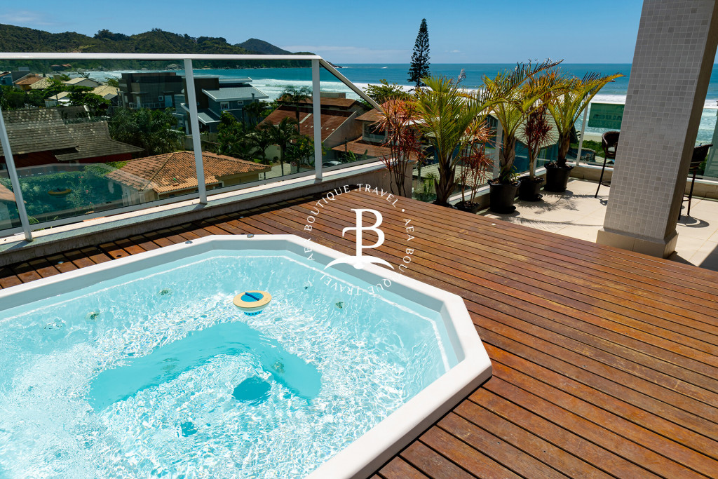 Cobertura espetacular, com total privacidade e área de lazer incrível, em frente à praia de Mariscal | Bombinhas. Com vista exuberante e decoração rústica contemporânea, este apartamento com varanda gourmet completa e equipada com churrasqueira, lounge e jacuzzi/Spa, além de garantir férias perfeitas para sua família, é definitivamente a melhor opção em Mariscal.