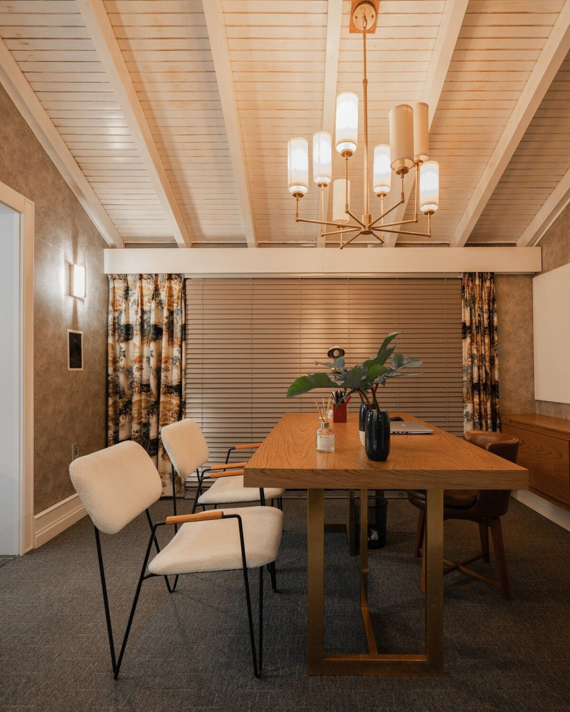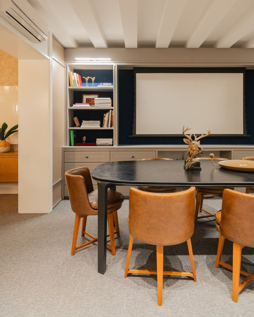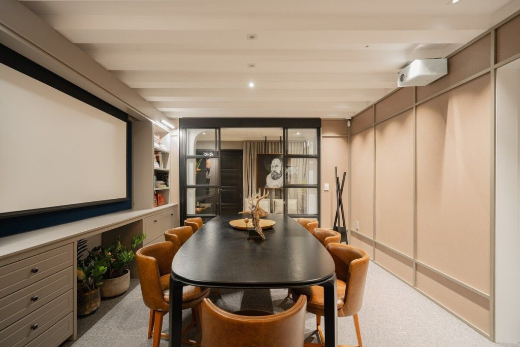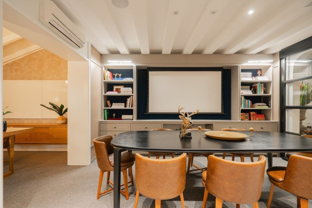 O espaço conta com:1 hall social com duas poltronas e 1 aparador tipo carrinho de chá1 sala de apresentação/reunião com 1 mesa de 320x110 cm e 8cadeiras giratórias em couro. Uma tela retrátil de 110 polegadas1 sala de apoio com 1 mesa de 180x100 cm, 1 cadeira giratória emcouro e 2 poltronas de aproximação1 cozinha com balcão de ilha, 1 fogão elétrico, 1 frigobar e 1 microondasEspaço de área de externa com lareira, banco em pedra em todaextensão, 1 gazebo coberto, 1 conjunto de duas poltronas e 1 sofáde 160 cm, 1 aparador em madeira de 200x30 cm, 1 mesa decentro1 Lavabo extremamente decoradoEspaço de churrasqueira com duas cadeiras e 1 sofá de 140 cmO ESPAÇO conta com som ambiente embutido em todos espaços,inclusive no jardim.Também conta com dois ares condicionados interno, wi-fi e iluminação externa
