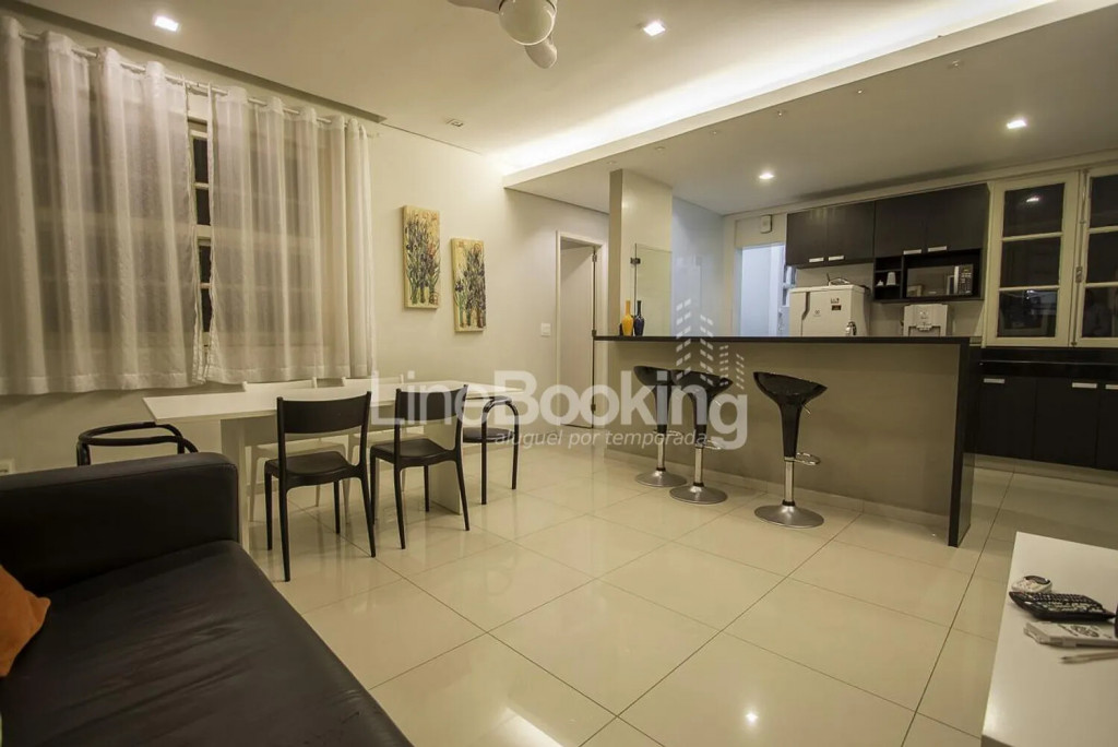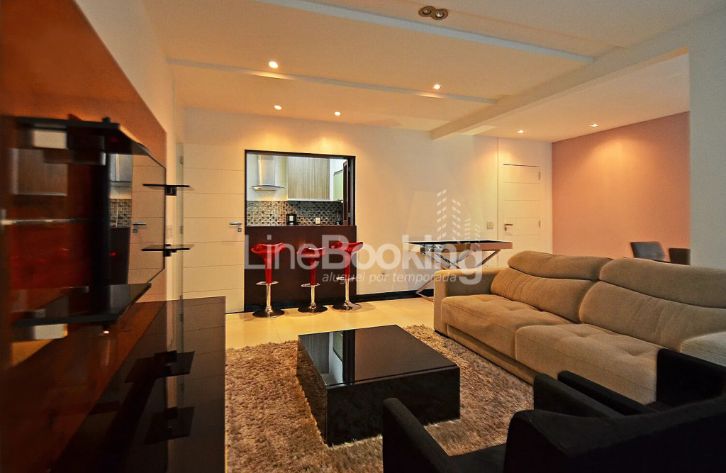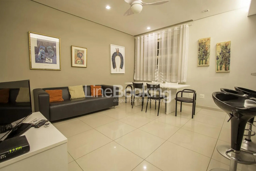 Sala: Sofá 3 lugares, Mesa de Jantar, TV LCD, Ventilador de teto com controle.