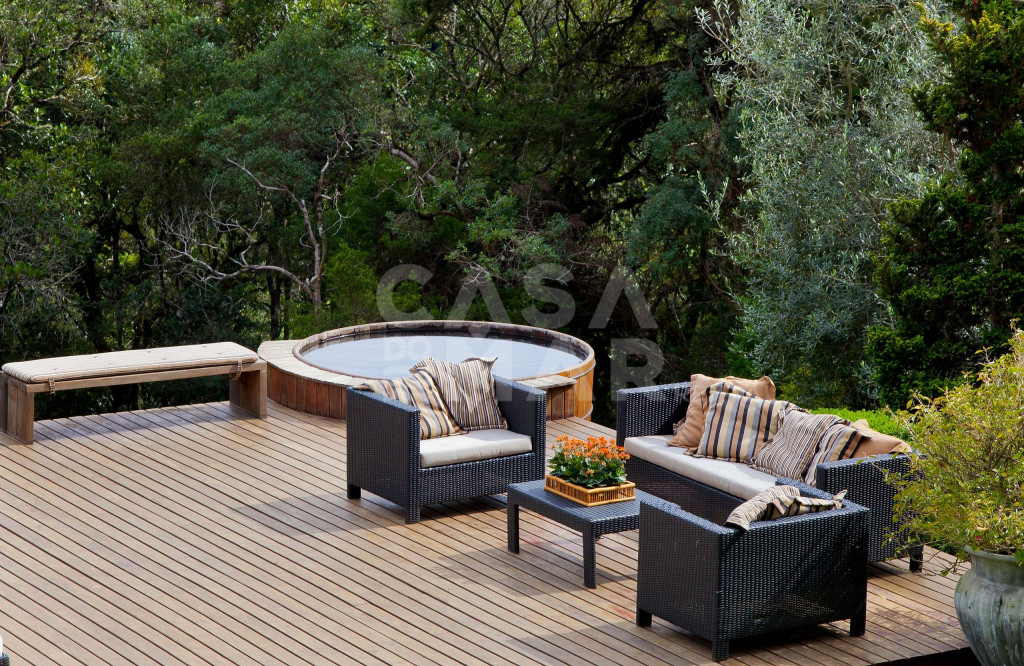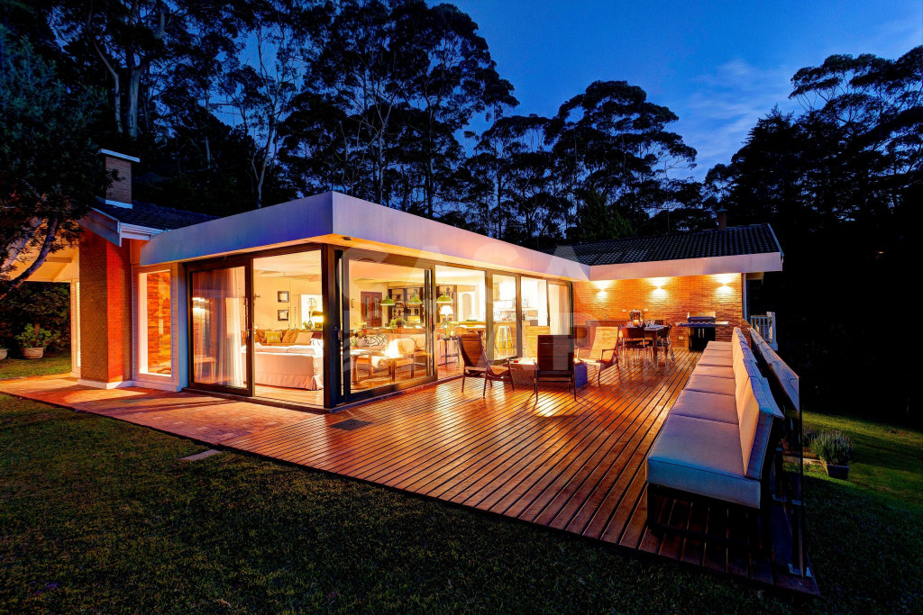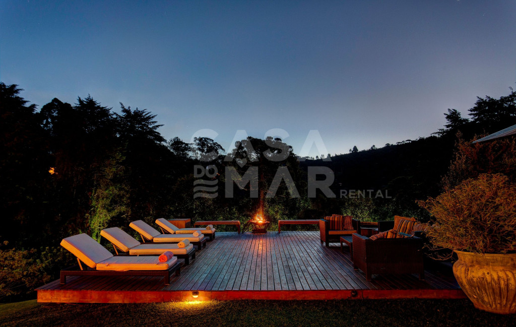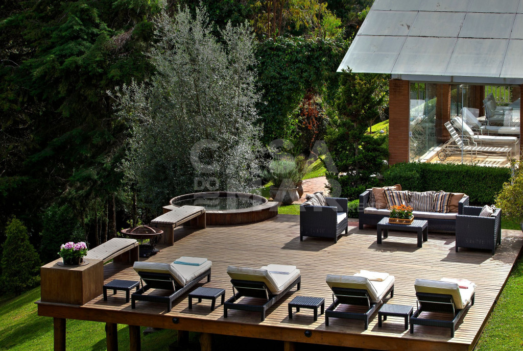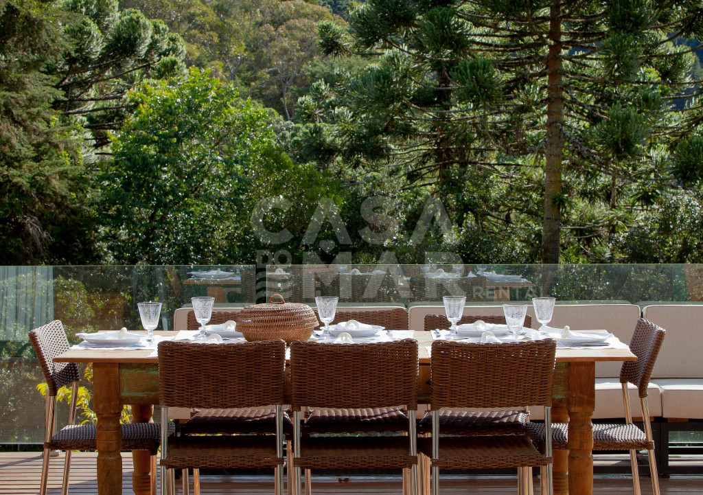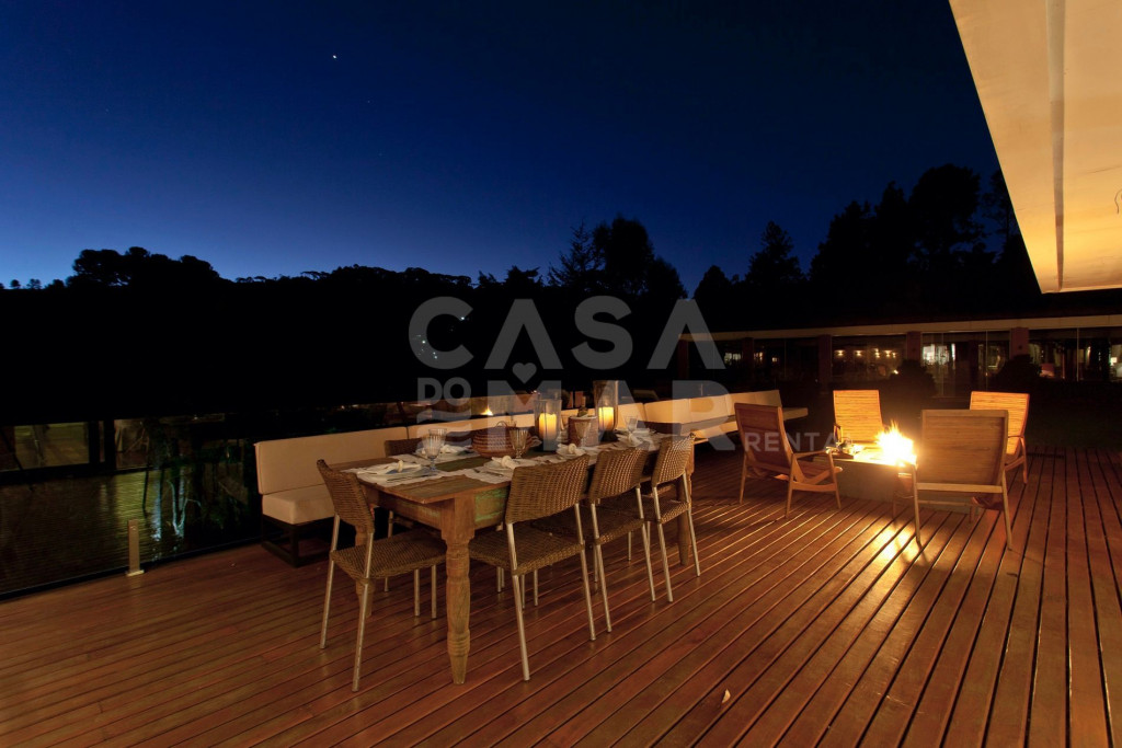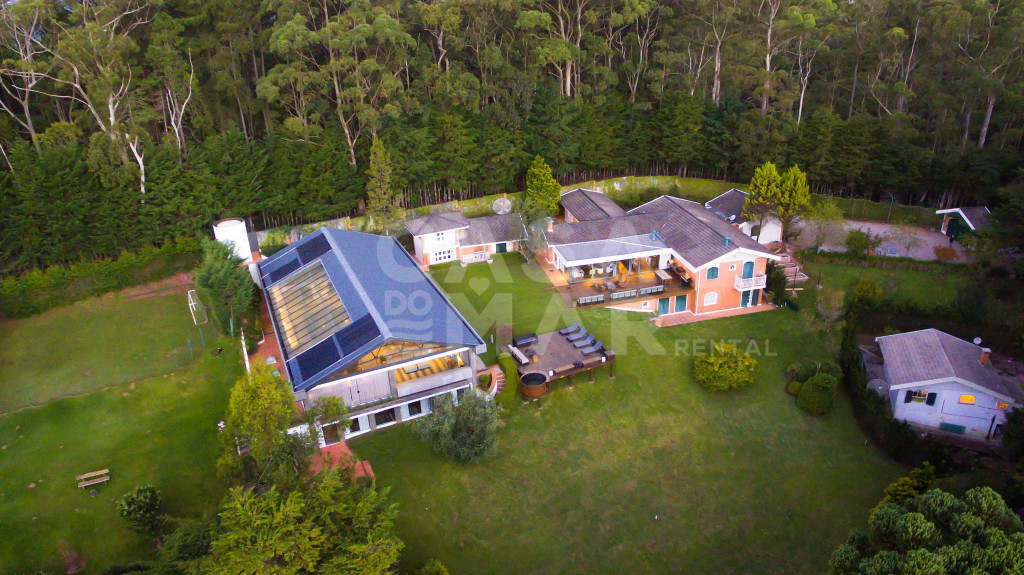 A casa possui um deck com ofurô e espreguiçadeiras, rodeada pelo verde da mata; um espaçoso living com lareira, cozinha gourmet e sala de TV também com lareira, galpão com piscina e sauna úmida e 8 suítes que hospedam com todo conforto 20 pessoas.Área externa possui 2 decks, para aproveitar ao ar livre. Um deles com espreguiçadeiras e um ofurô e o outro com churrasqueira, lareira externa e ambiente aconchegante. O terreno conta também com um espaçoso galpão recém reformado, onde fica a piscina, que pode ser aquecida, e a sauna úmida. No mesmo Galpão temos uma mesa de pebolim e snooker tamanho oficial, equipamento de som e telão de alta tecnologia e choperia profissional, além de um forno de pizza. Ao todo são 5 lareiras, 3 a gás e duas a lenha.