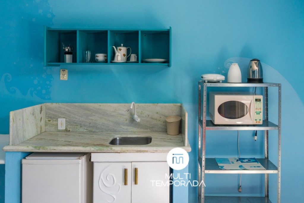 A suíte é ampla (40m²), confortável e climatizada com cama de casal, sofá-cama de casal e colchão adicional de solteiro (sob consulta), banheiro privativo, cozinha compacta com: frigobar, micro-ondas, torradeira, chaleira elétrica, bem como utensílios de cozinha. Além disso ela possui TV Smart 32'', bancada para trabalho, armário com cabides e maleiro, varal e varanda com rede para o seu descanso.A pousada possui ACESSO DIRETO À PRAIA (portão) e tem uma infraestrutura externa bem fantástica repleta de natureza, piscina, vestiários, ducha externa, guarderia de pranchas, playground para crianças, mirante e balanço de frente pro mar. Também disponibiliza uma cozinha compartilhada com: mesa para 12 pessoas, fogão a gás, fogão e forno à lenha, micro-ondas, geladeira com freezer, pia, churrasqueira, grelhas e espetos, panelas e todos utensílios básicos de cozinha. Por fim, temos estacionamento e um bar próximo da piscina com possibilidade de servir dentro da propriedade e na Praia.